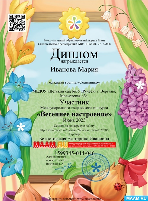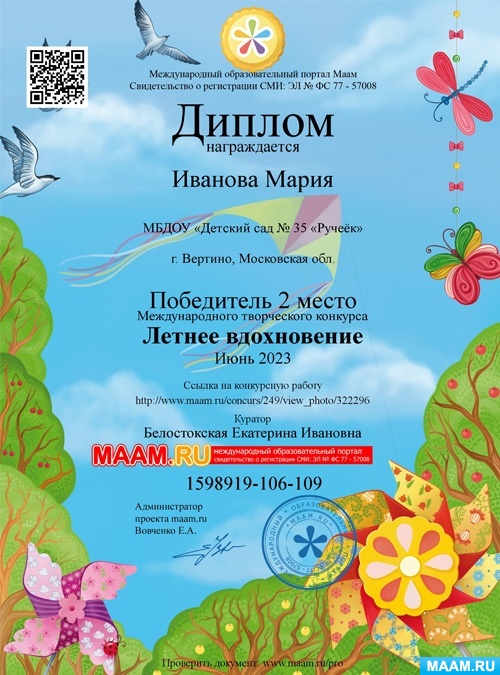 Всегда интересно, о чем думают наши дети, как они развиваются. С этой целью МААМ проводит ежемесячные конкурсы для дошкольников, младших школьников и педагогов. Чтобы оценить лучшие творческие работы, которые выбираются в результате пользовательского голосования, портал учредил специальный диплом победителя. Мы рады всем участникам конкурса, правилами которого предусмотрены также дипломы участников и сертификаты кураторов.