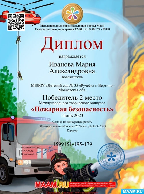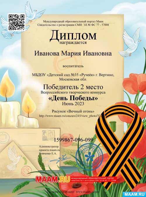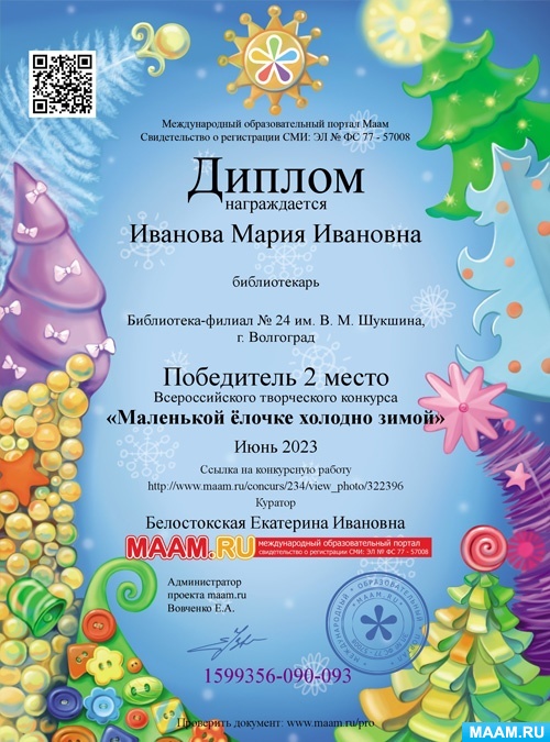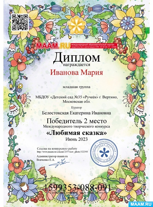 Каждый, кто добавит работу на конкурс, может заказать «Диплом участника» или «Диплом победителя» (если работа наберёт требуемое количество голосов) для ребенка и для взрослого или «Сертификат куратора» для педагога или воспитателя.