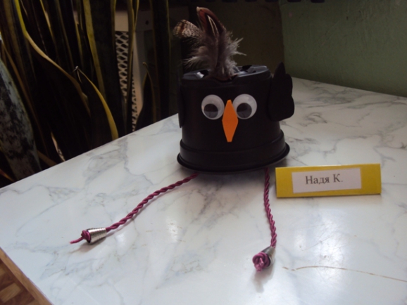 Для работы требуется разовый стаканчик, самоклеющаяся пористая резина, глазки, перышки для хохолка, бечевка для лапок, скотч.