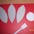 Для изготовления открытки понадобится шаблон, распечатанный на формате А4. Гвоздики делаются из салфетки, сложенной несколько раз и вырезанной в форме круга. Края надрезаются ножницами и окрашиваются красным маркером. Затем складываются несколько раз и закрепляются с помощью степлера. Детали клеются на открытку клеем "Момент".