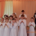вучит колокольный звон. Дети старшей подгруппы входят в зал. Ведущий (микрофон) Купола сверкают ярко, Колокольный звон плывёт, Перезвонами своими, Он добро нам...