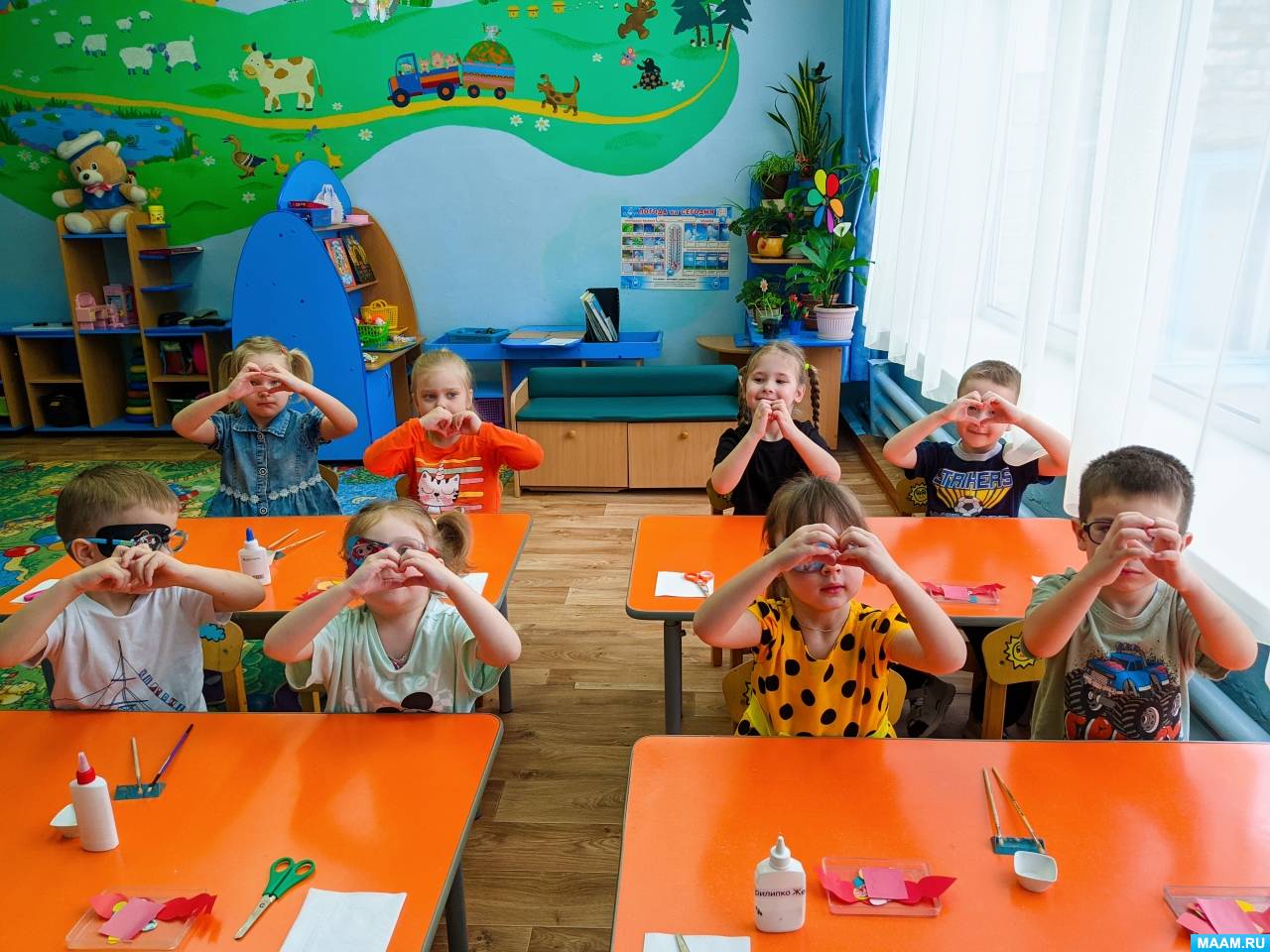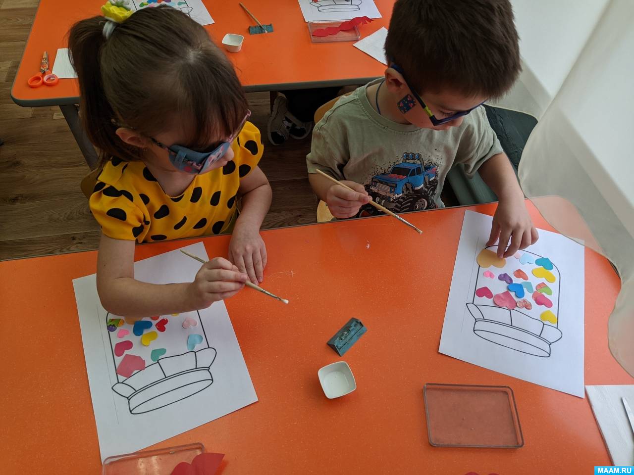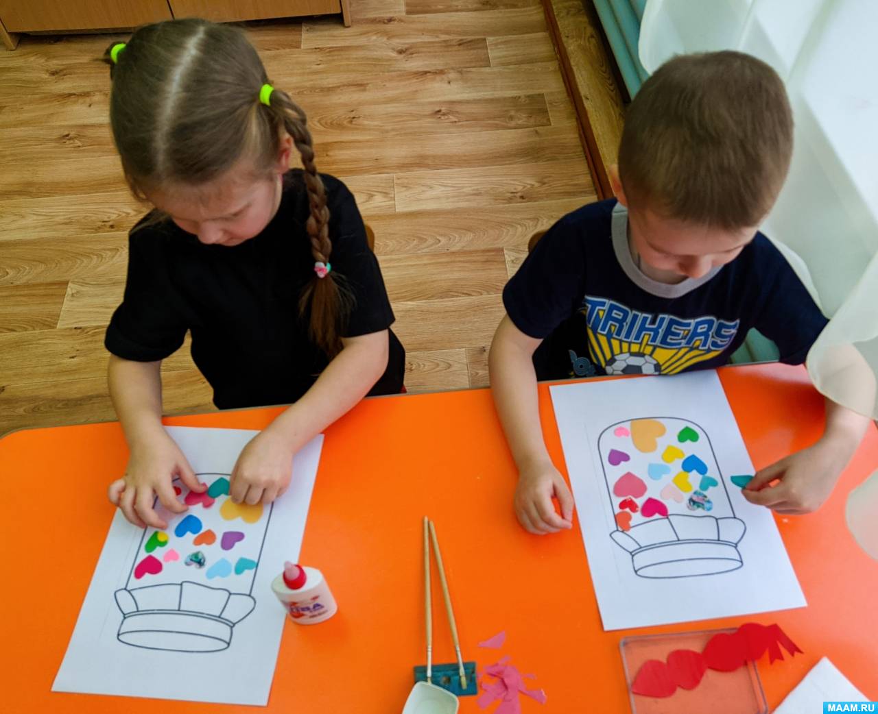 - Дети приклеивают сердечки.
