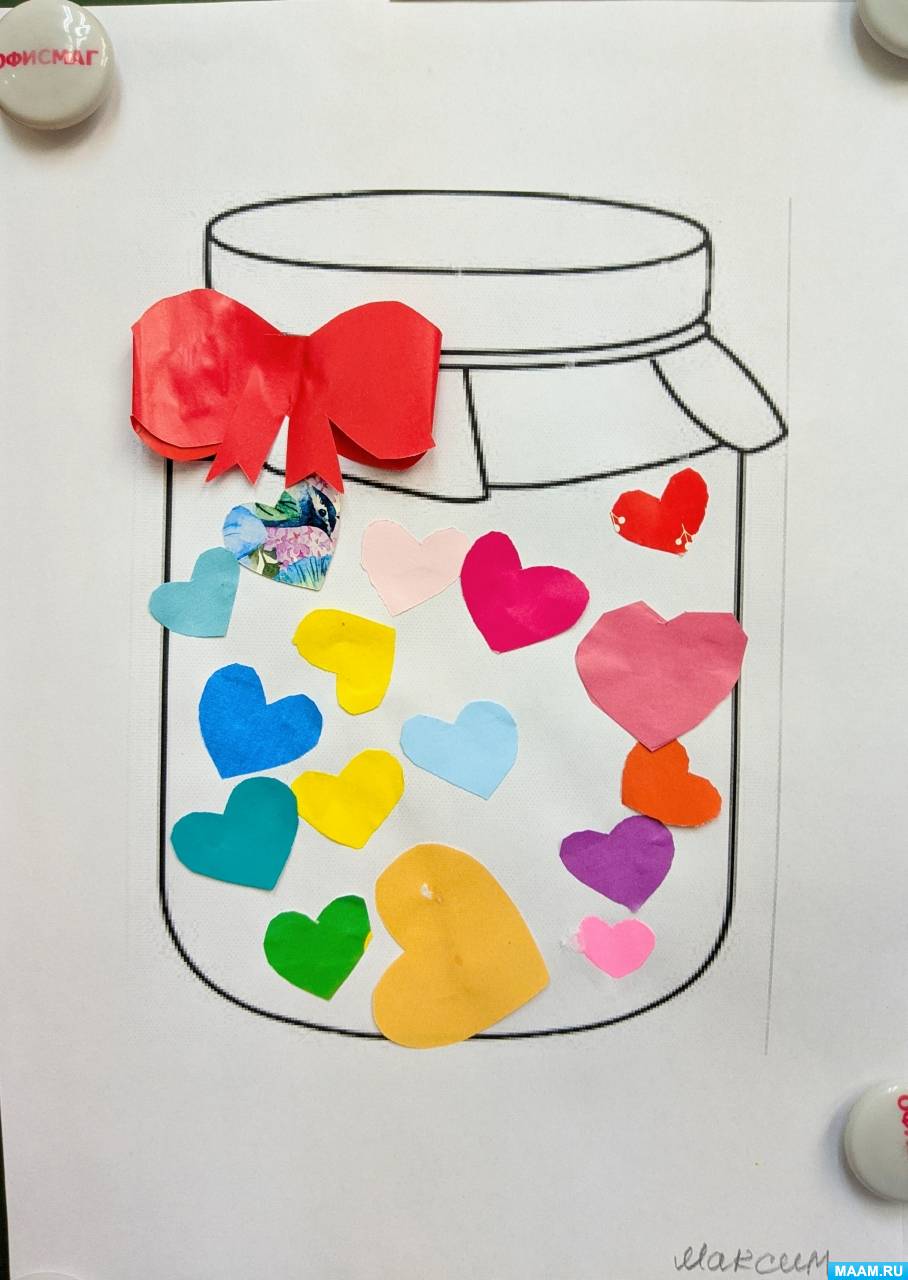 Материал: лист белой бумаги с распечатанной баночкой (А4, сердечки разного цвета и размера, квадрат с нарисованным большим сердечком для вырезания ребёнком, деталь-растяжка "бантик" для самостоятельного складывания ребёнком, клей, кисточка, салфетка.