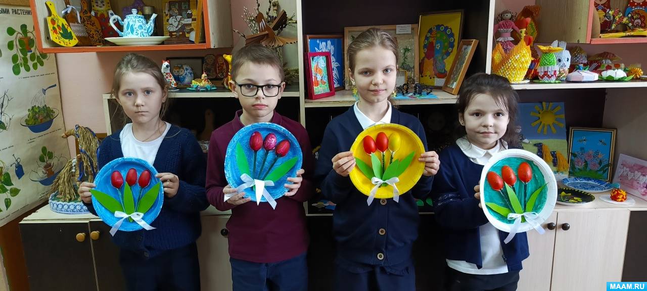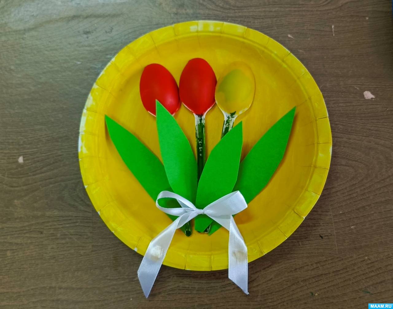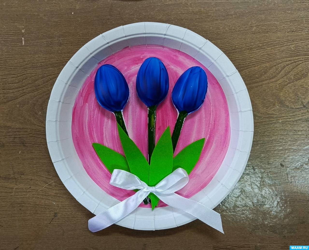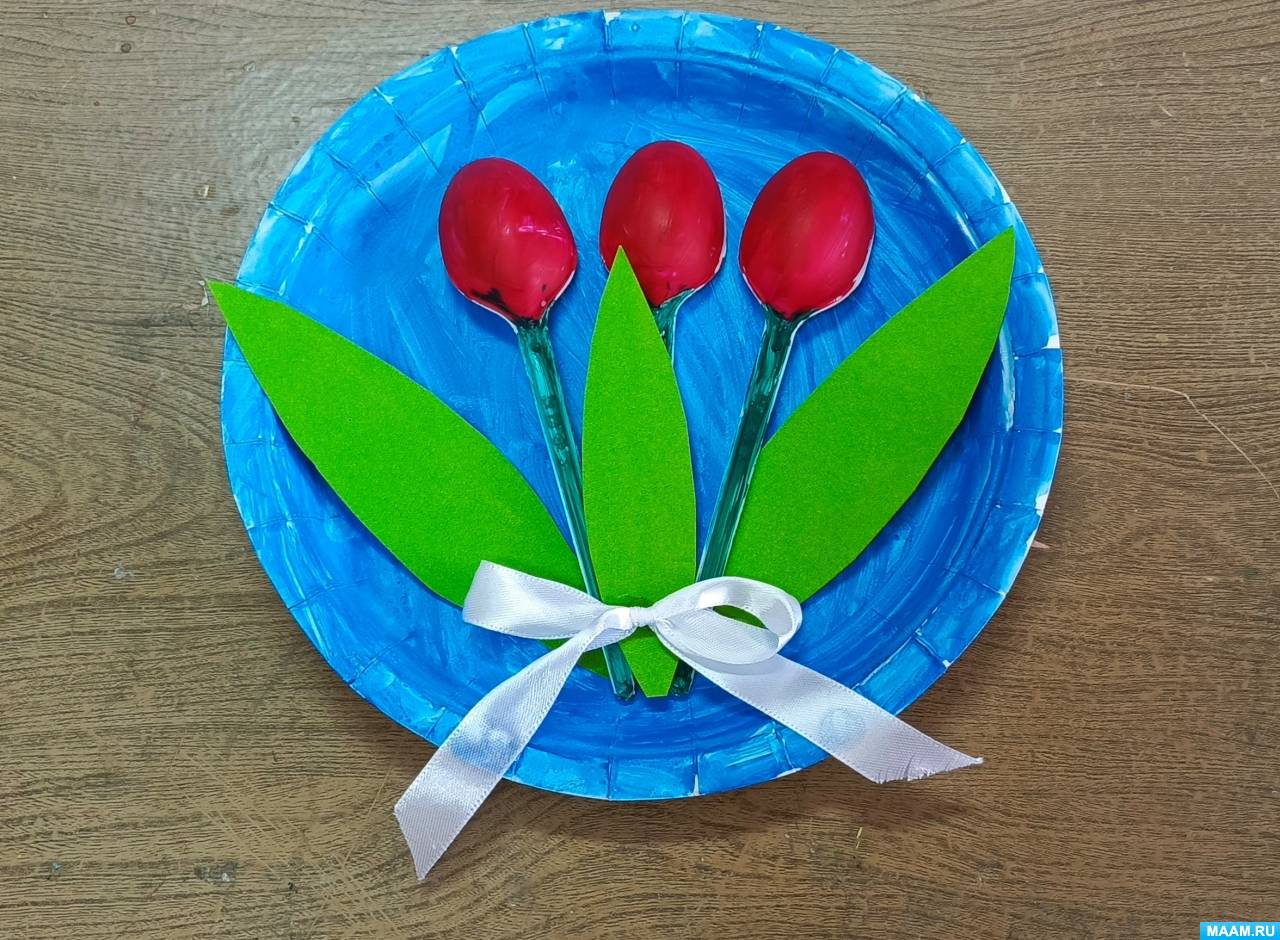 «Букет тюльпанов». Мастер-класс по изготовлению поделки из одноразовых тарелок и пластиковых ложек с детьми 7–8 лет