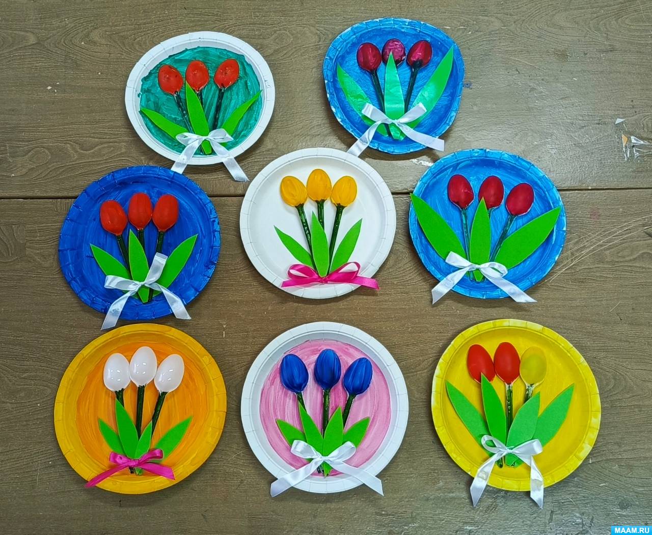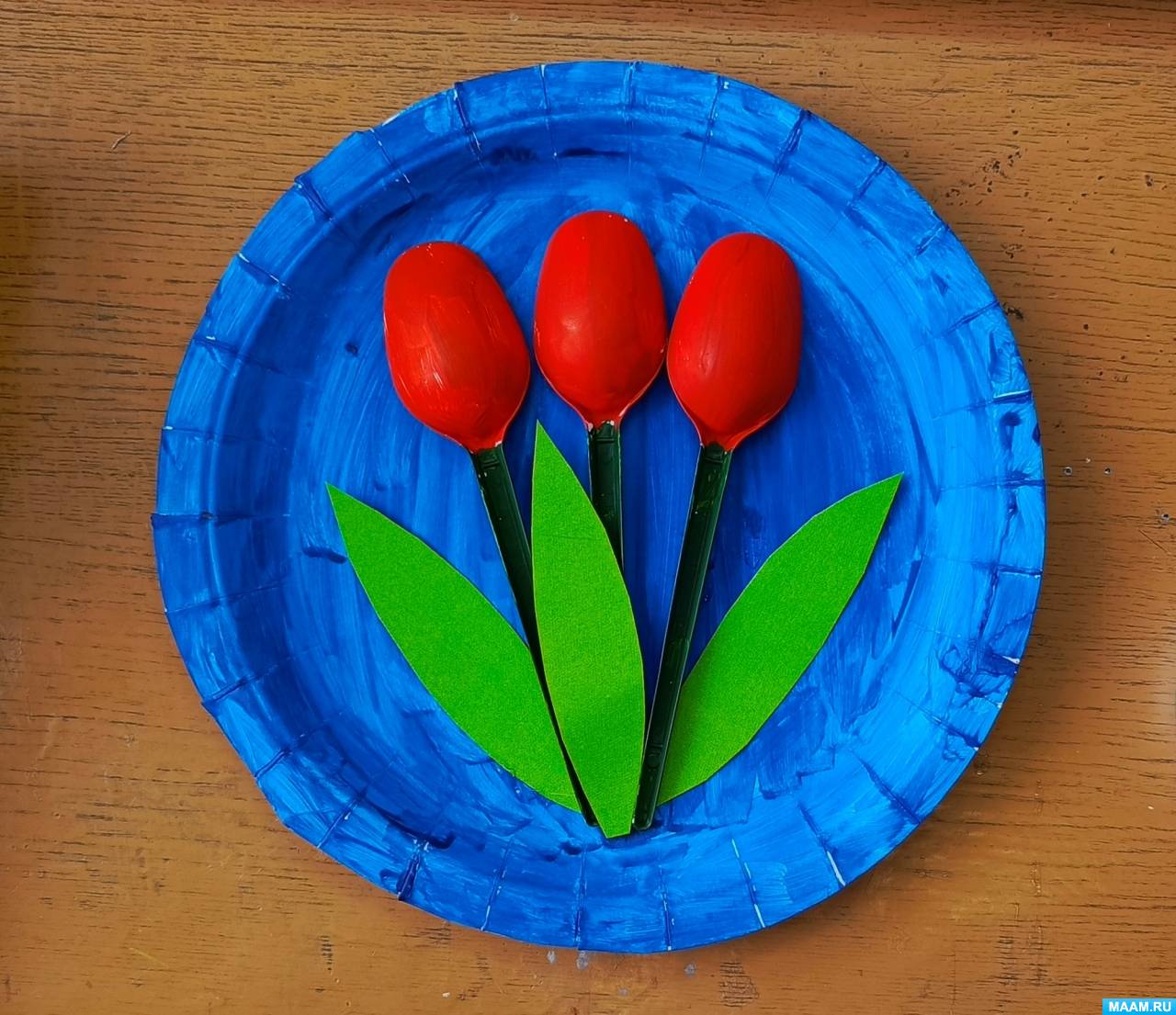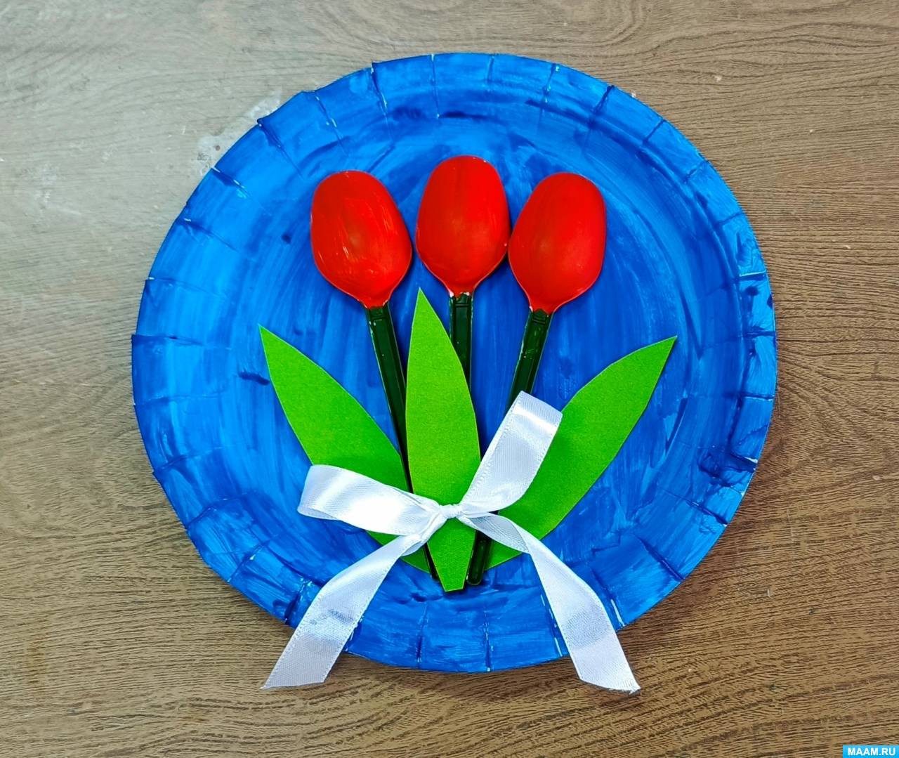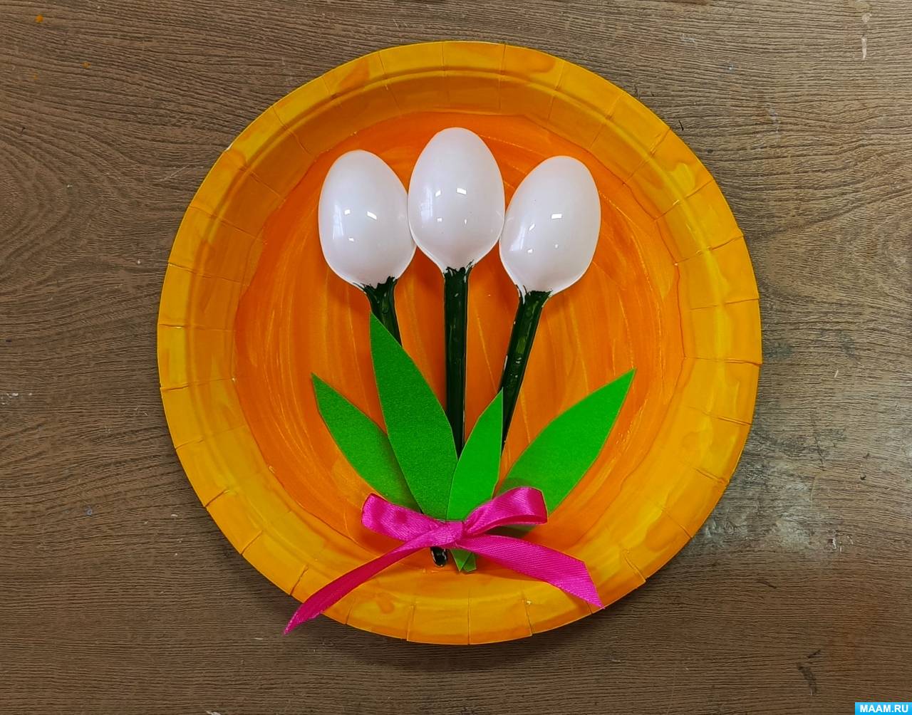 «Букет тюльпанов». Мастер-класс по изготовлению поделки из одноразовых тарелок и пластиковых ложек с детьми 7–8 лет