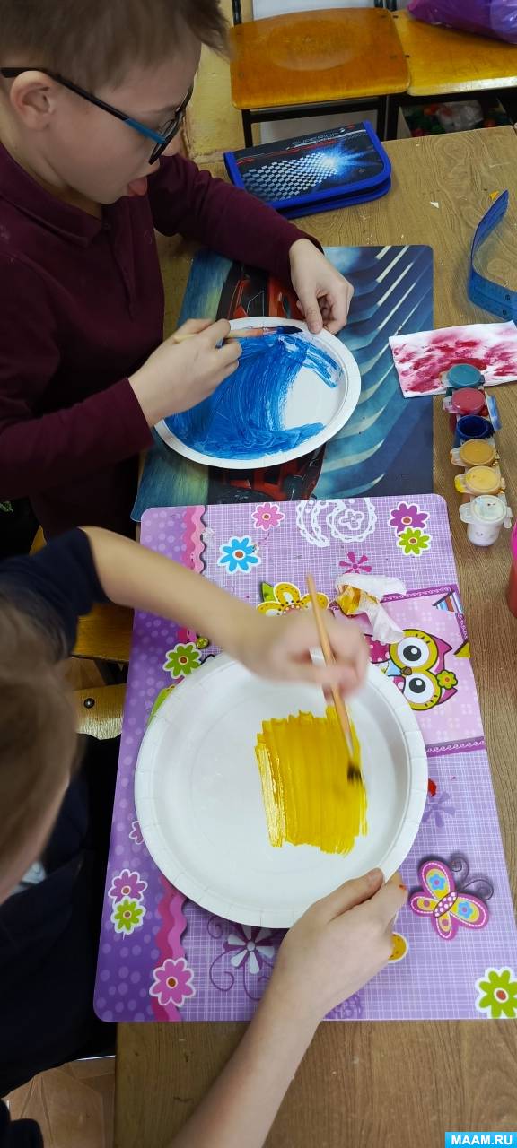 Этап 2. Раскраска бумажных тарелок. Дети аккуратно раскрашивают бумажные тарелки гуашью. Оставляют просохнуть.