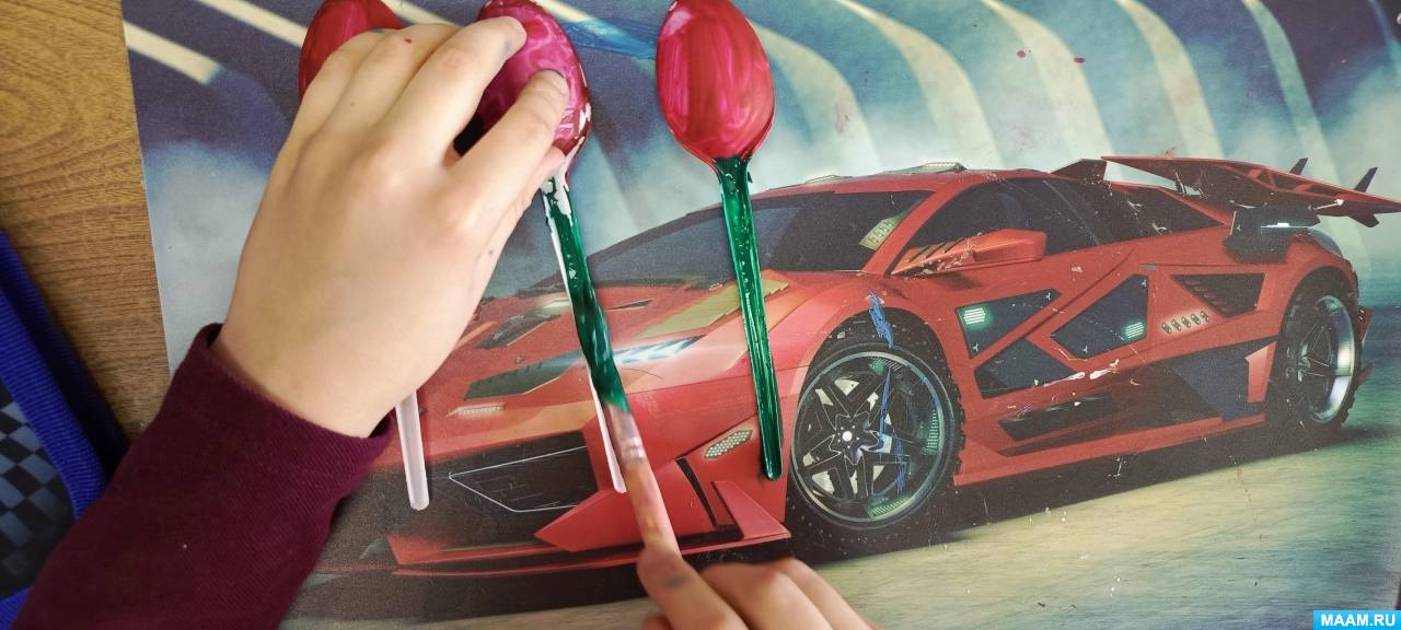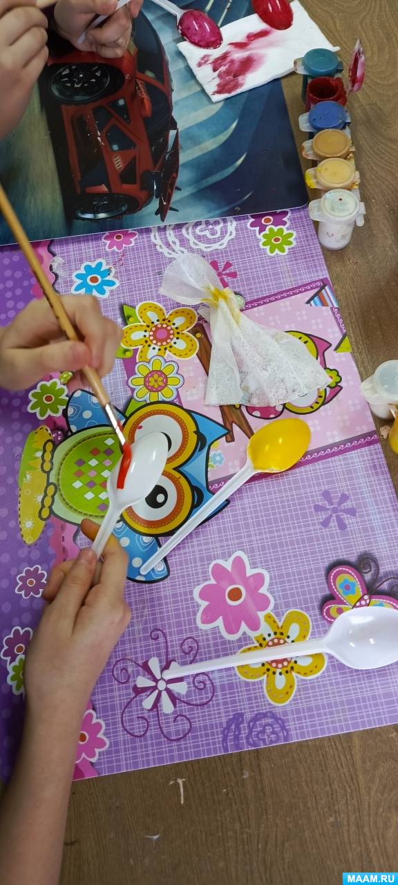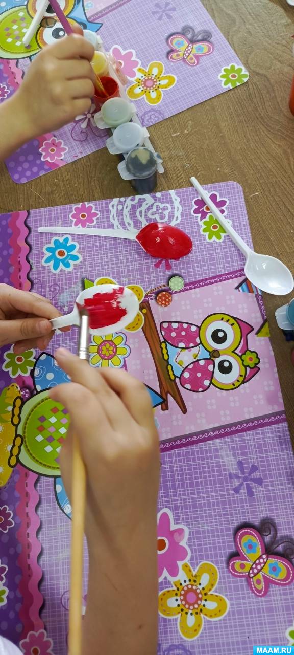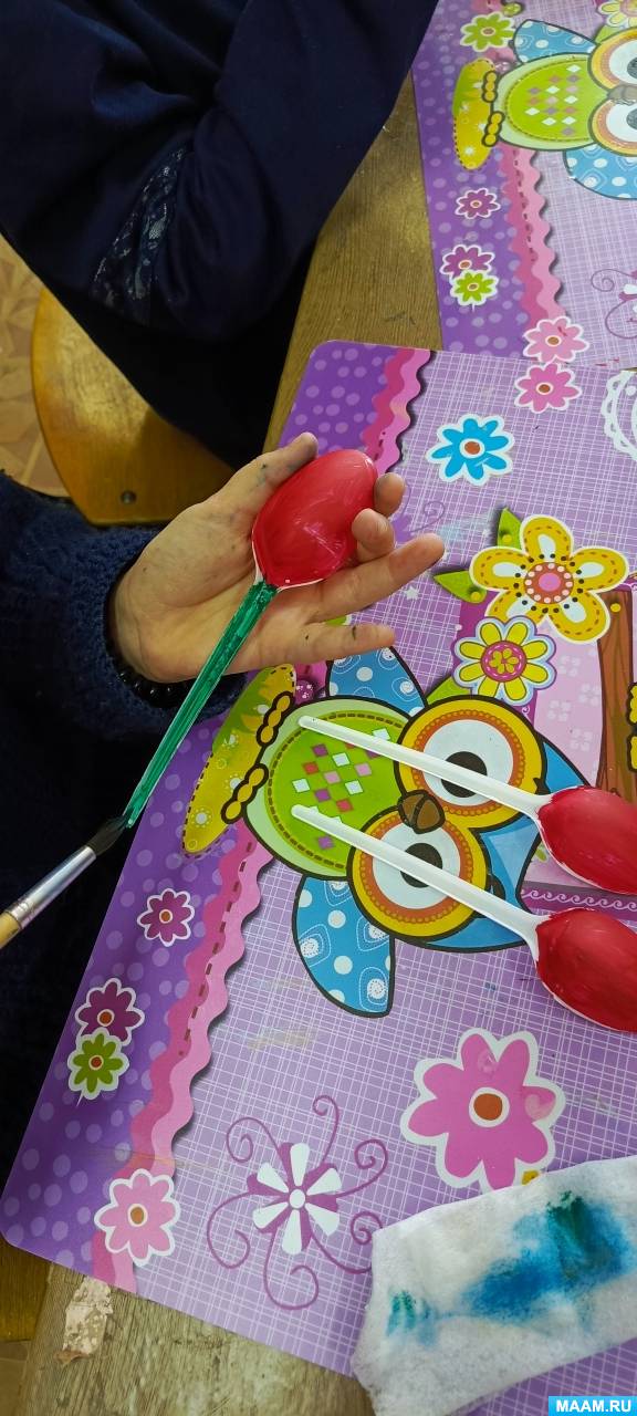 Этап 3. Раскраска пластиковых ложек. Следующим этапом дети красят пластиковые ложки яркими красками: верх ложки красный, розовый, синий, желтый и др.