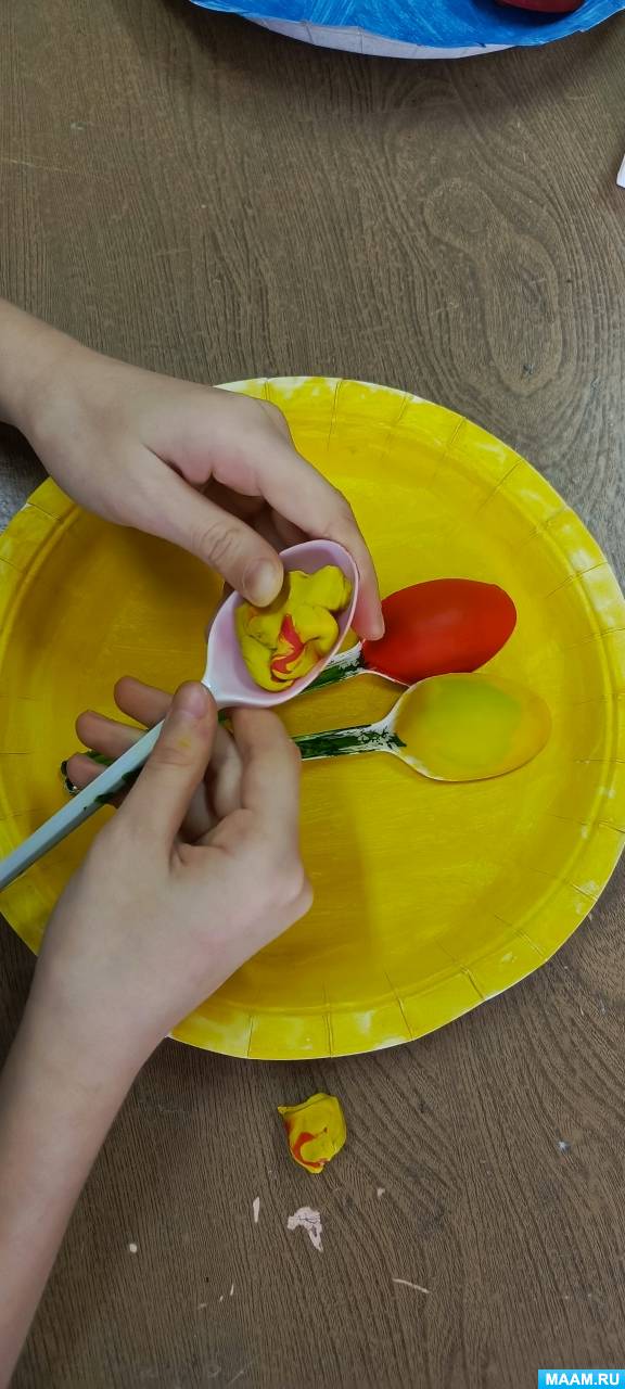 Этап 4. Приклеивание ложек к тарелке. После высыхания красок обучающиеся заполняют ложку пластилином и равномерно прикрепляют к поверхности тарелки так, чтобы поместилось три цветка.