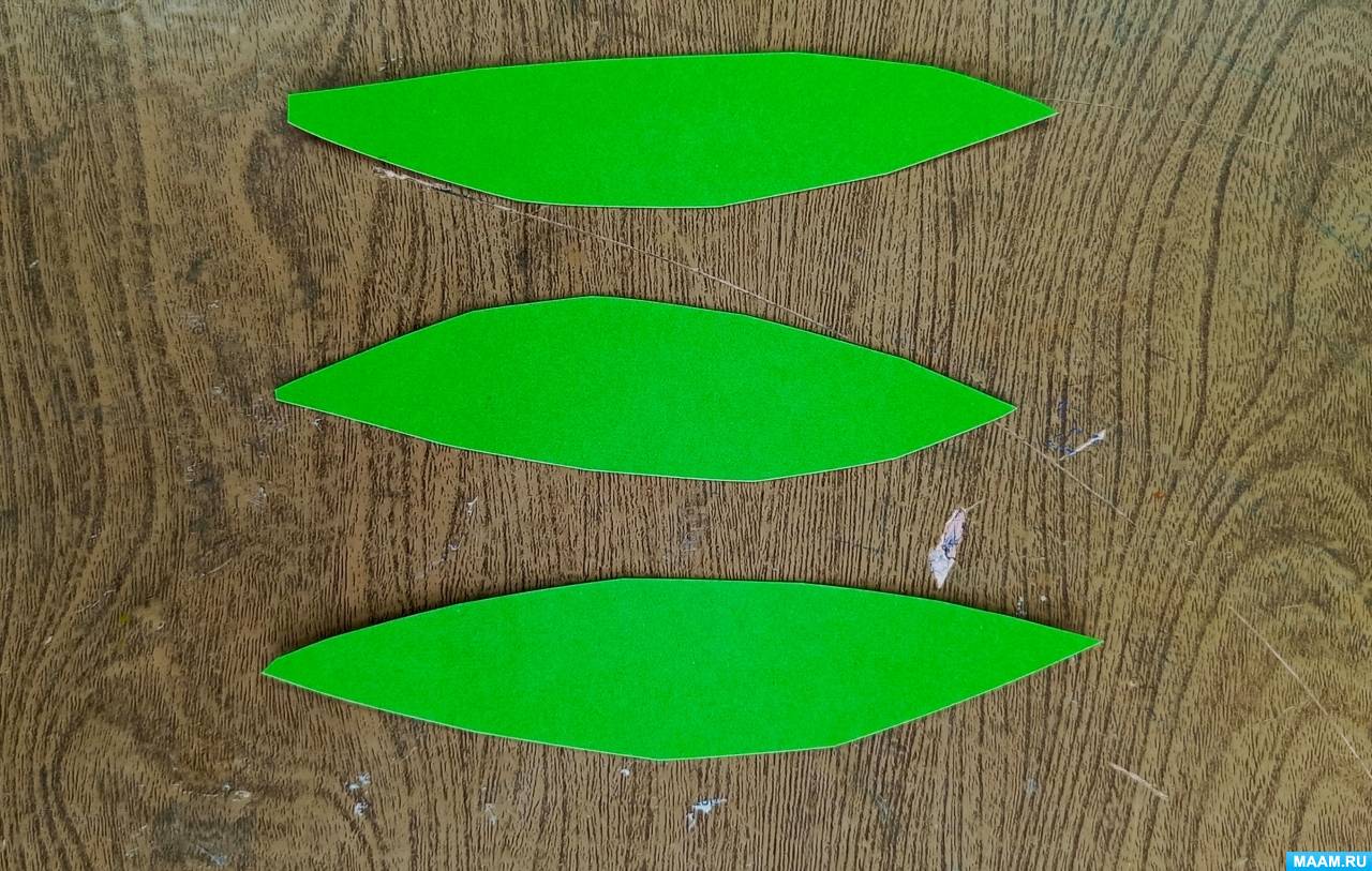 Этап 5. Создание листьев. Используя зелёный картон, дети рисуют длинные узкие листики и вырезают. Листья приклеиваются клеем «Титан».
