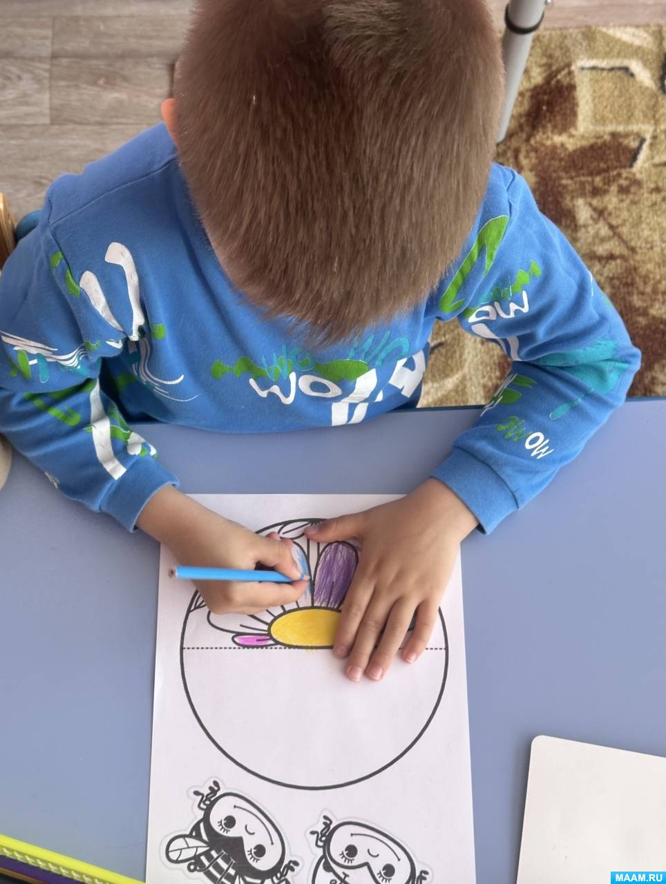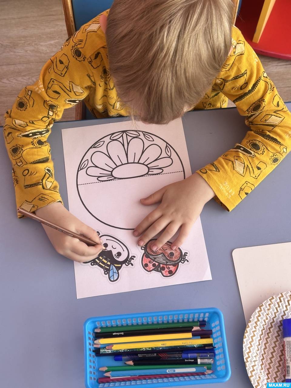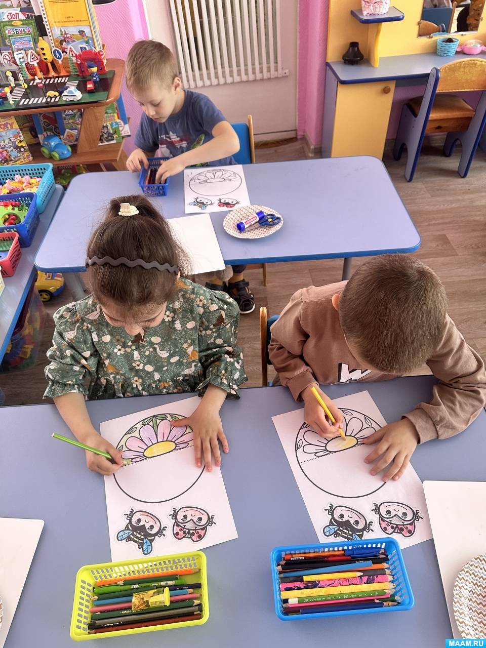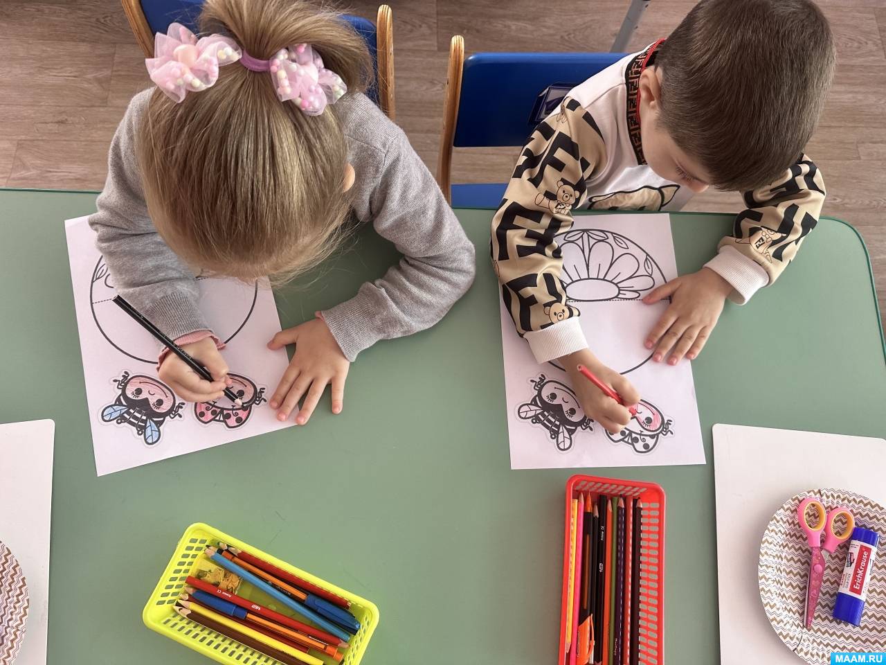 1. Мальчики и девочки разукрасили заготовки яркими карандашами. Педагог контролирует, чтобы ребята рисовали аккуратно, соблюдая направление линий и не заходя за границы контура.