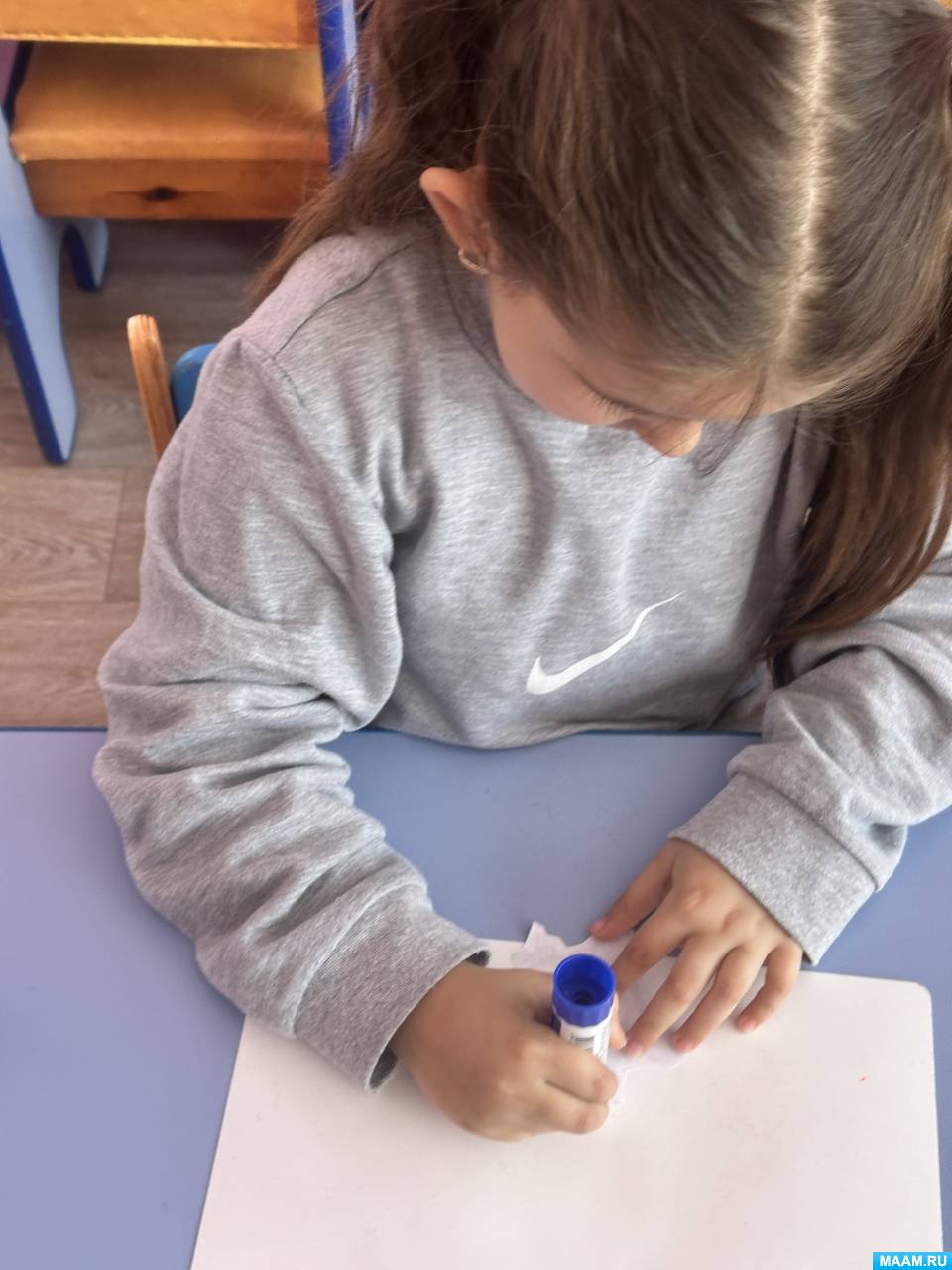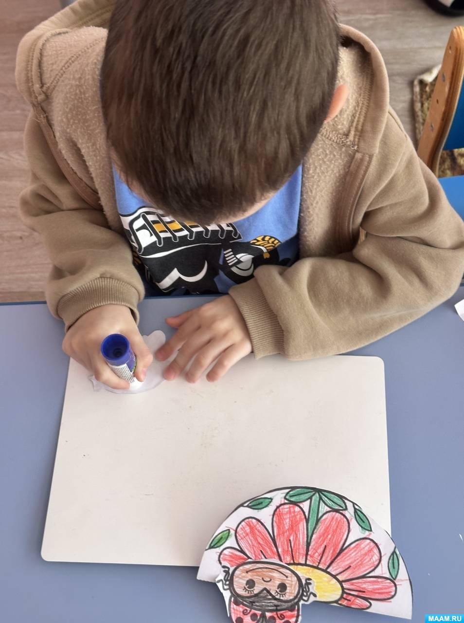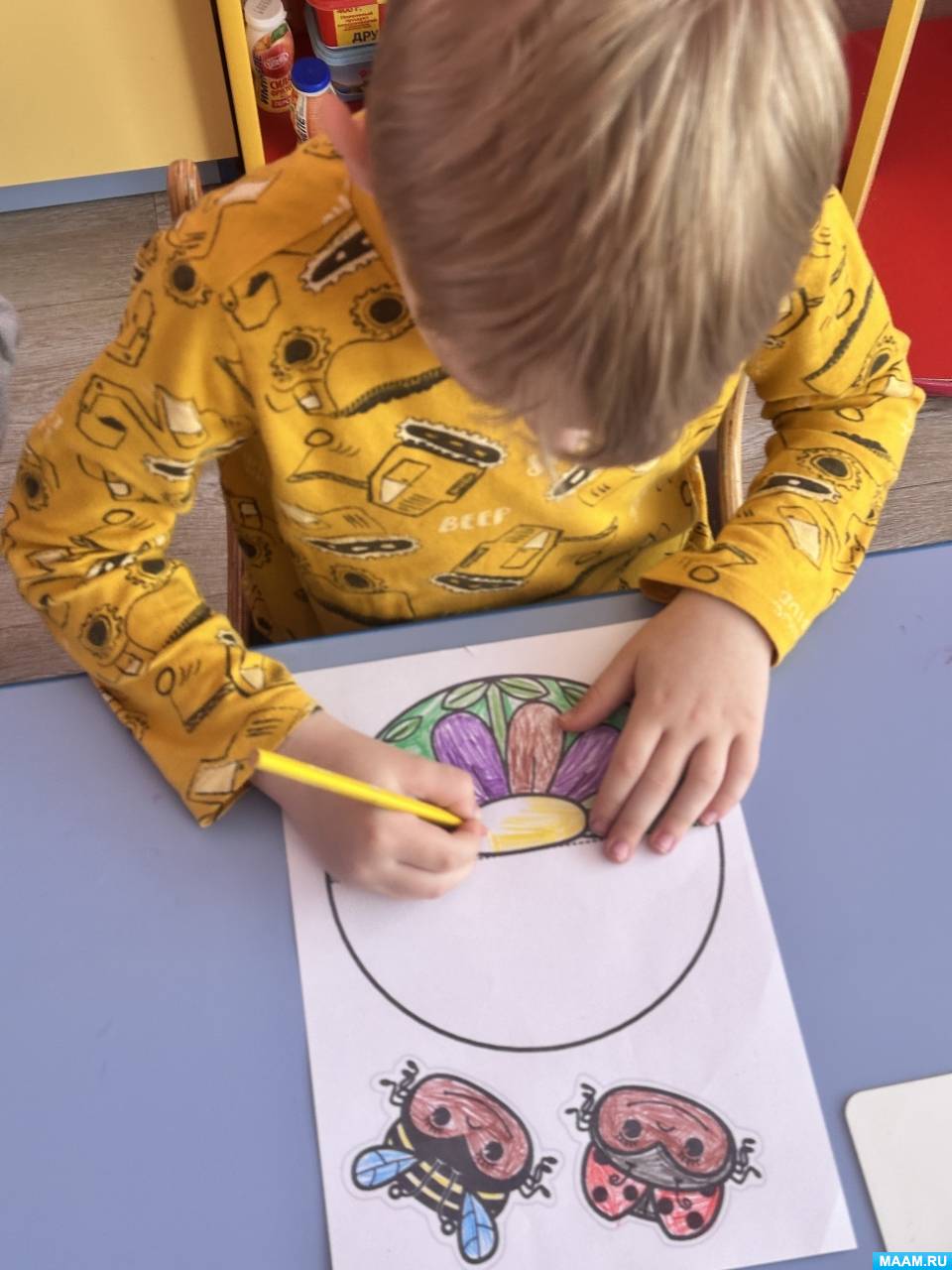 4. Следующим этапом было нанесение клея на фигурки божьих коровок и пчелок, после чего дети приклеили их аккуратно на подготовленную поляну.