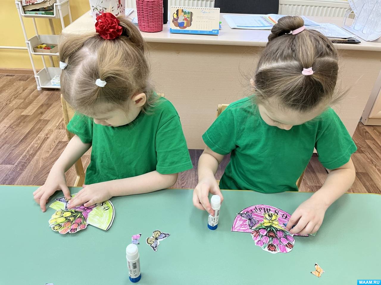 4. В завершении творческой работы девочки собирают единую композицию (приклеивают клеем к подставке букет тюльпанов и бабочки).