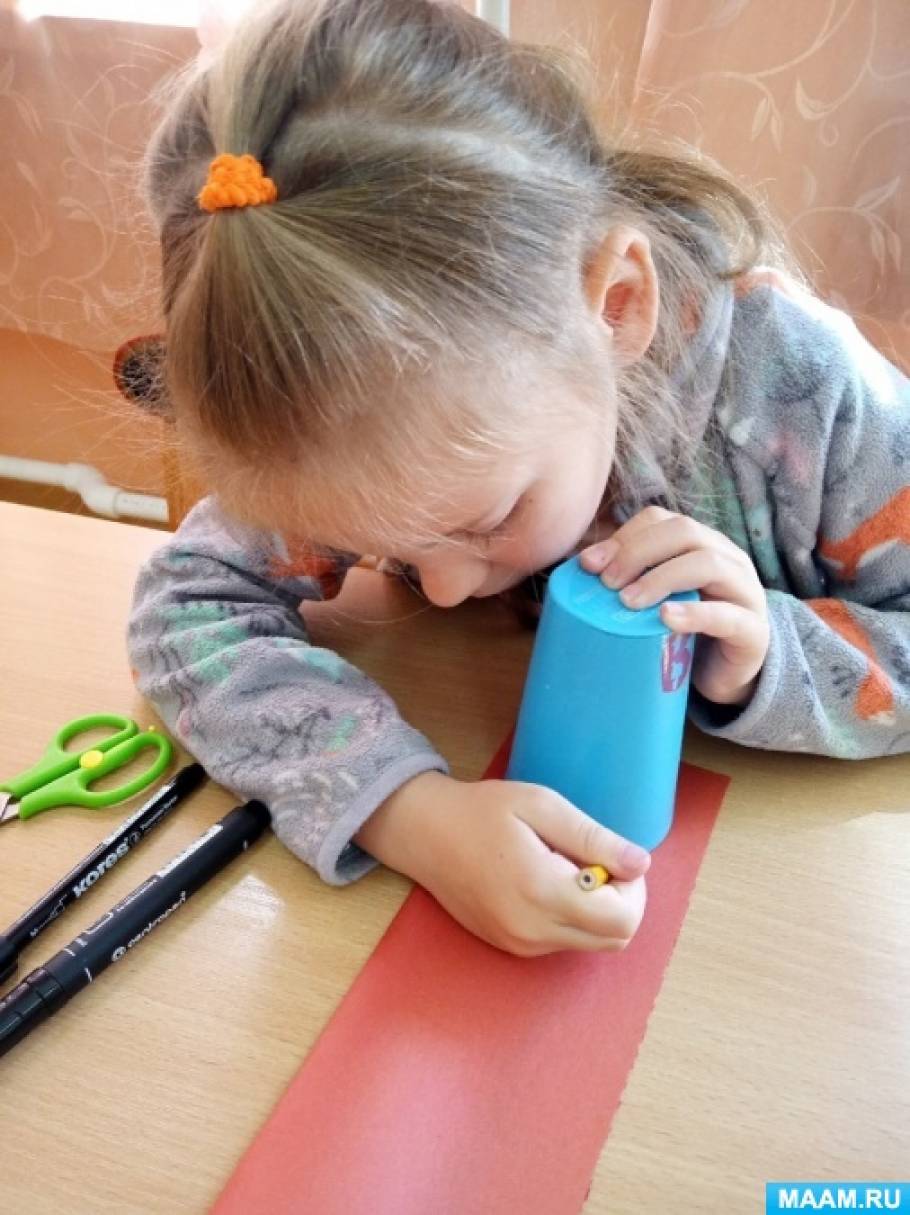 1. На листе бумаге красного цвета обводим простым карандашом пластиковый стаканчик.