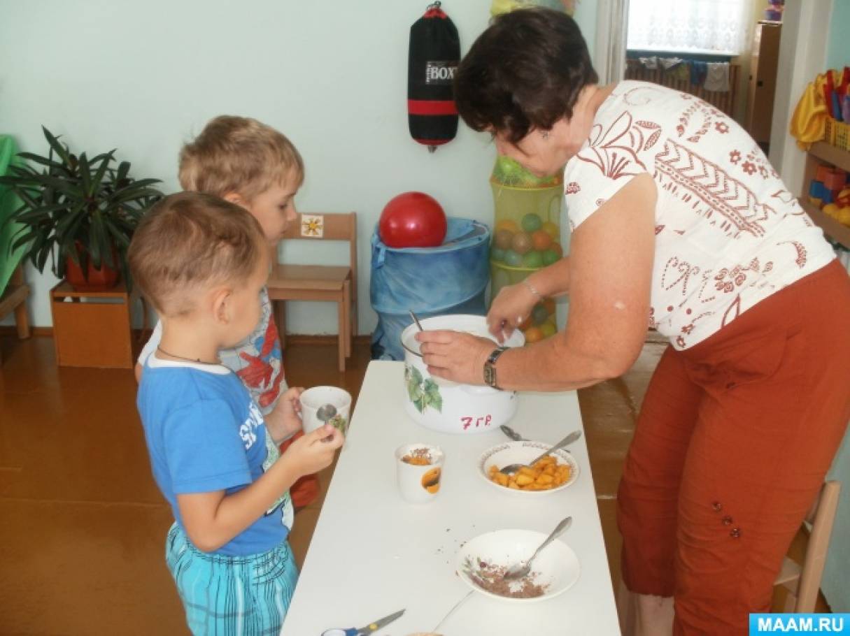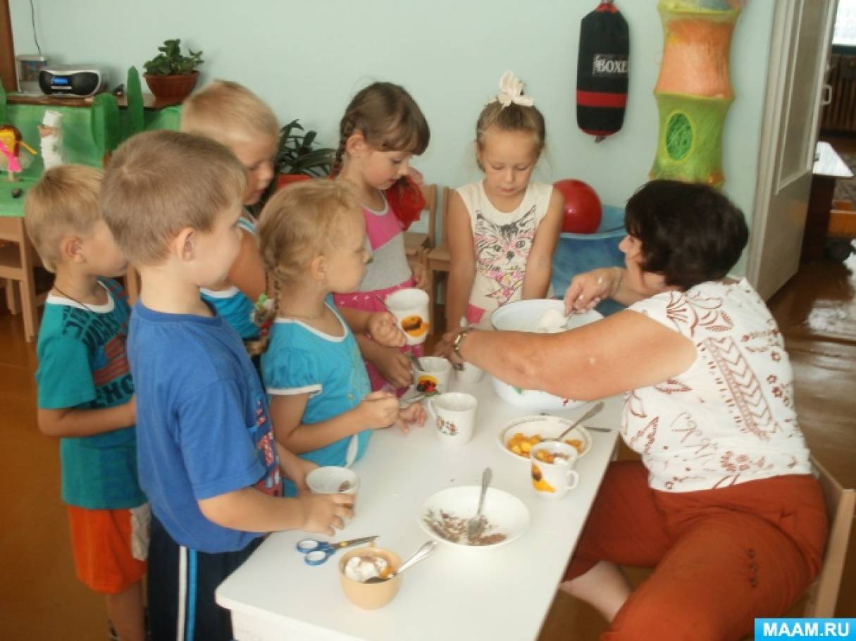 Дети посещают кафе. Сюжетно-ролевая игра "Кафе", в которой дети выбирают наполнители для мороженного : шоколад, банан, нектарин. Такая форма развлечения позволяет в игровой форме и непринудительной обстановке углубить и закрепить знания воспитанников.