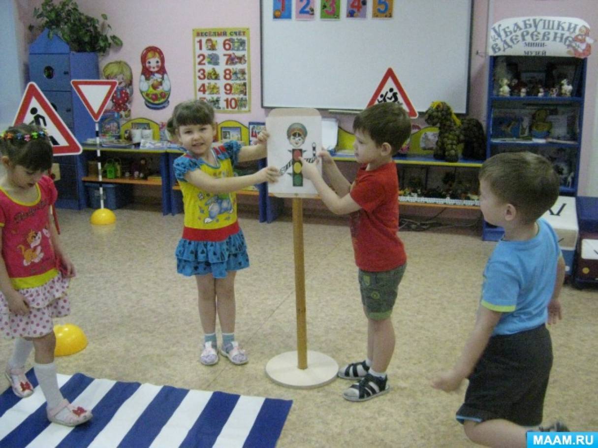 Расширили знания детей о светофоре. Закрепили знания о значении сигналов светофора (на красный свет пешеходы и автомобили стоят, на желтый — готовятся к движению, на зеленый — двигаются).