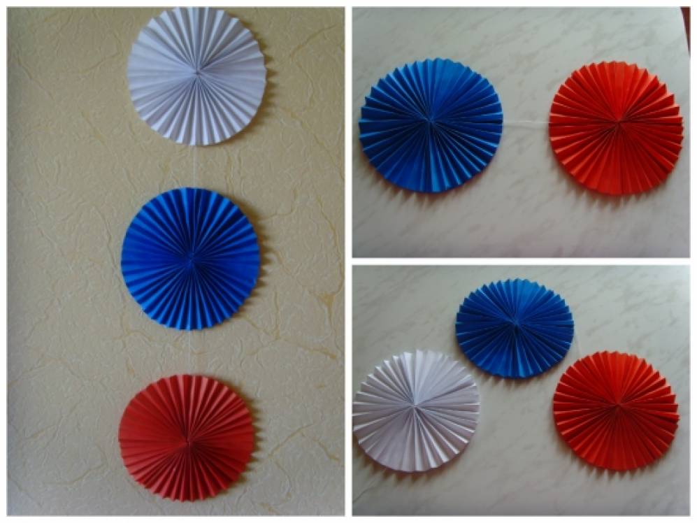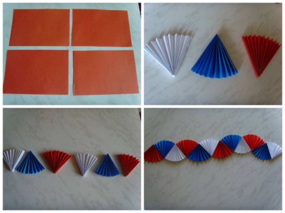 Для этого оформления нужна бумага формата А-4, клей карандаш, ножницы, нитки. Гирлянды были изготовлены ко Дню России, поэтому и цветовая гамма соответствует символике нашего флага. Я предлагаю базовую основу этих поделок, вы можете сделать их любого цвета, размера и нужной длины.