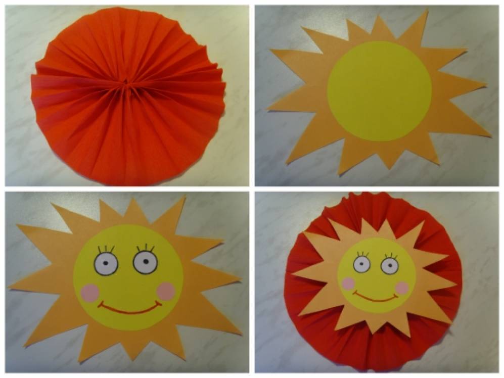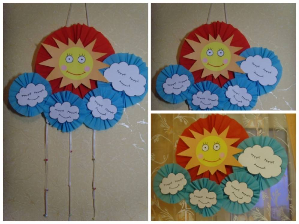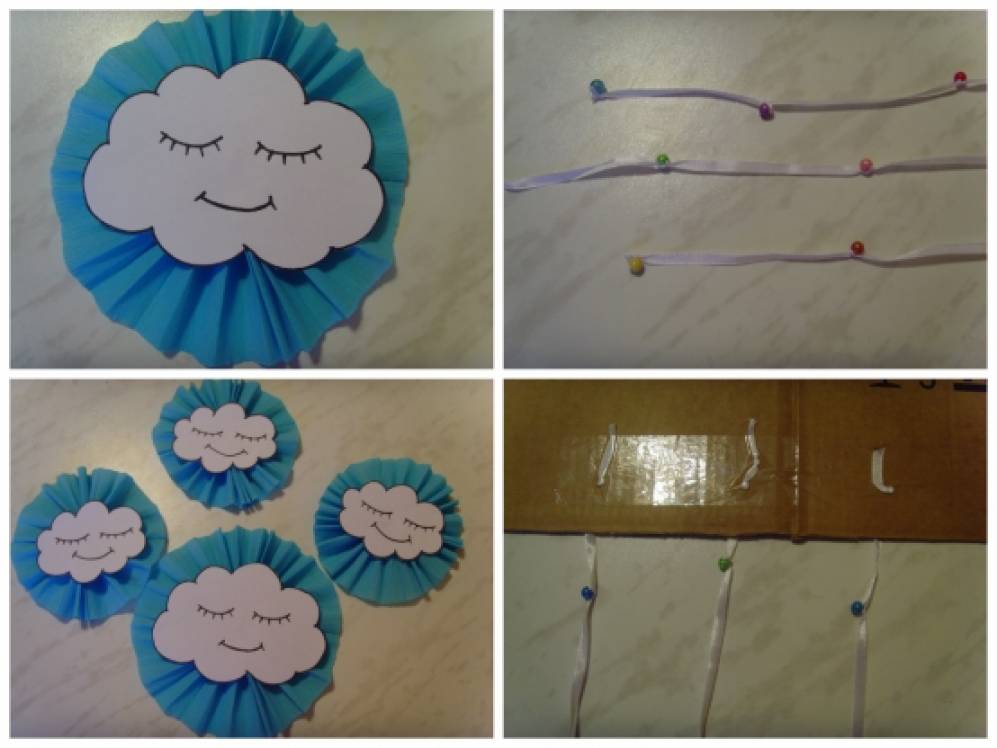 Тучки и солнышко приклеиваем на упаковочный картон. При желании можно сделать подвески из атласных лент и бусинок.