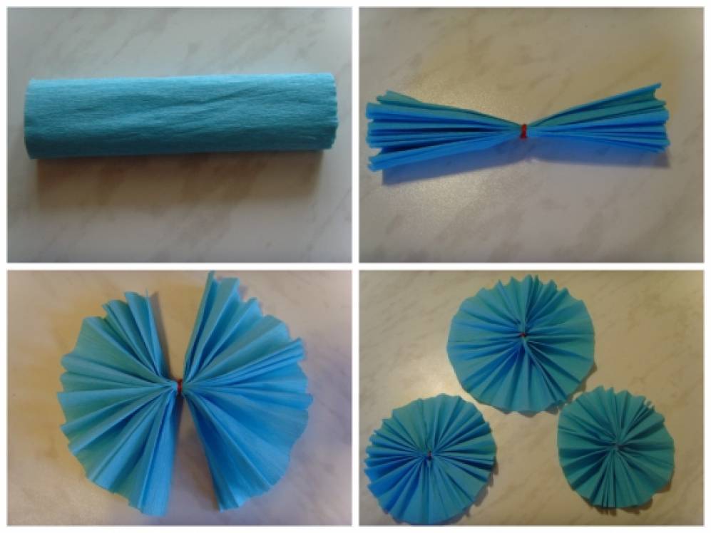 1. Делаем заготовки из гофрированной голубой бумаги для тучек. Всего их должно получиться четыре штуки(3 - одинаковых по размеру и 1 побольше)