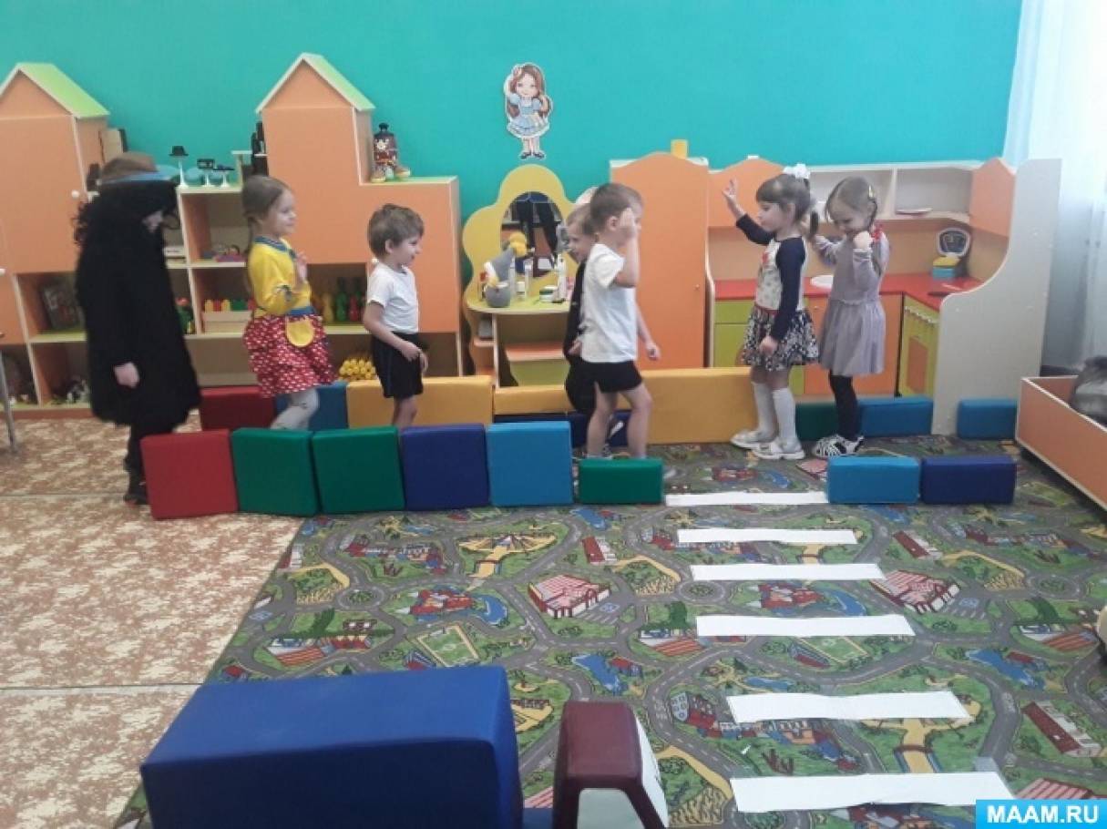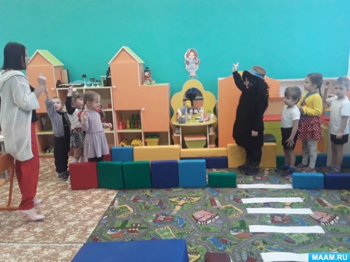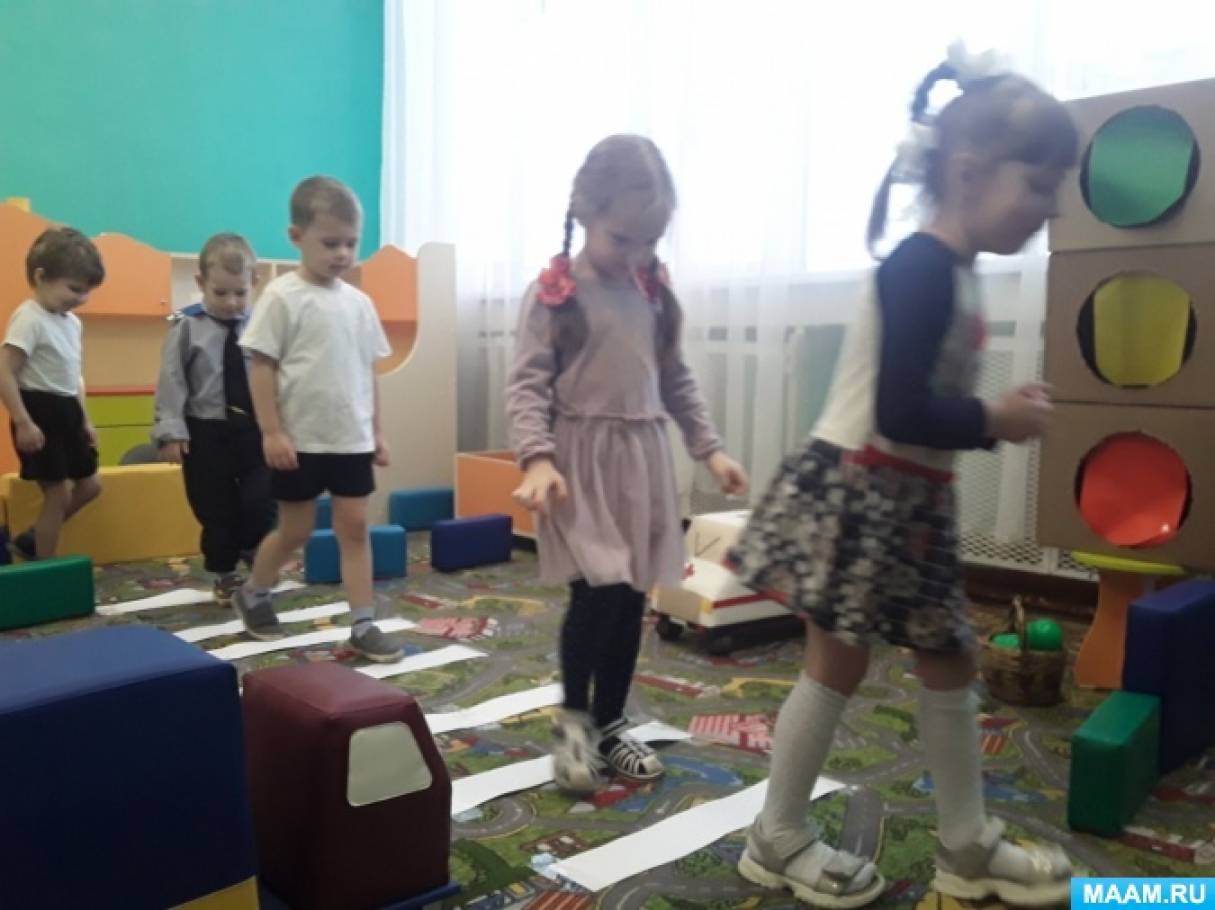 При показе таблички определённого цвета дети, дети стоя перед пешеходным переходом, выполняют команды - "жёлтый "(взять пакеты в руки, - "красный" (поставить пакеты на землю, - "зелёный" (с пакетами в руках ходьба на месте. .