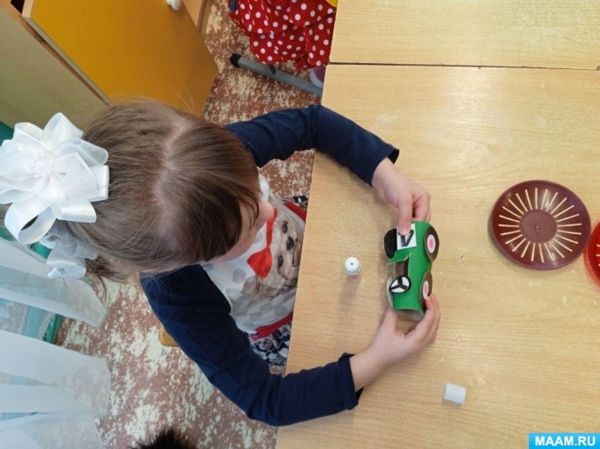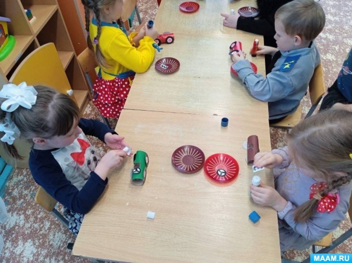 Вос-ль: Ребята нам пора возвращаться обратно, а чтобы нам не забывать про наше путешествие по городу, предлагаю склеить сувениры из картона и бумаги, гоночные машины из готовых деталей- шаблонов!