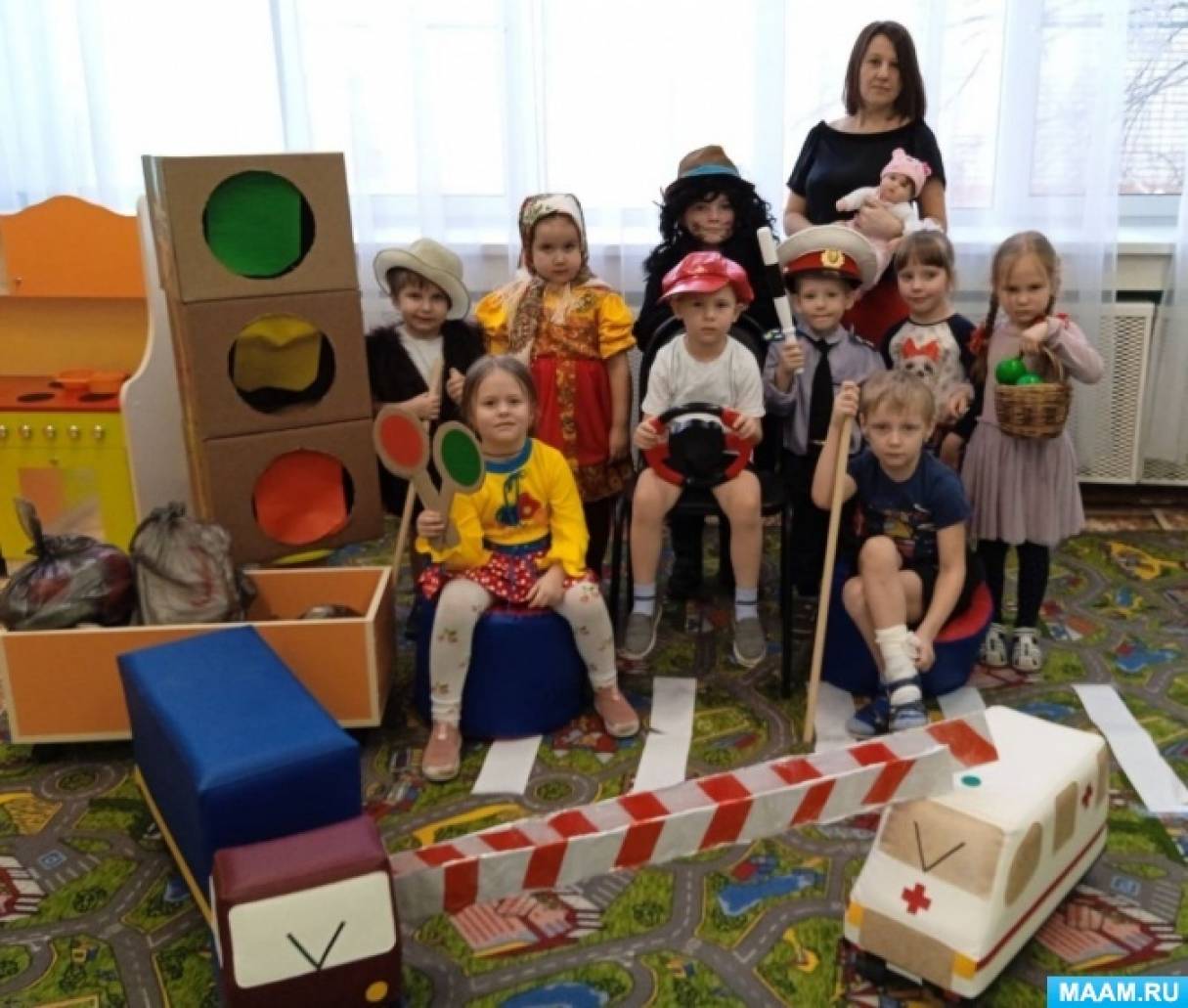 Правила игры: перед детьми муляж светофора из коробок с отверстиями трё х цветов: нужно мячиком попасть в отверстие зеленого цвета. Попавший в цель переходит по " Зебре" и оказывается на автобусной остановке!