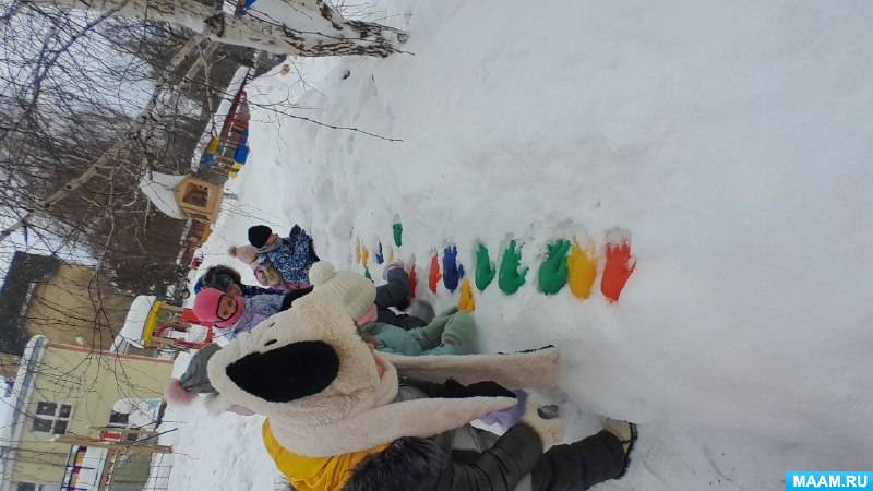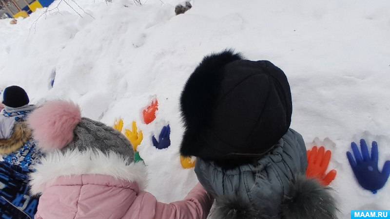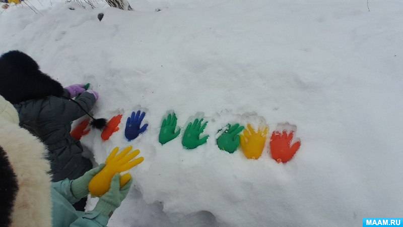 Дети выбирают места в снегу и аккуратно «сажают» ладошки, создавая композицию. Можно расставить их по цветам радуги.