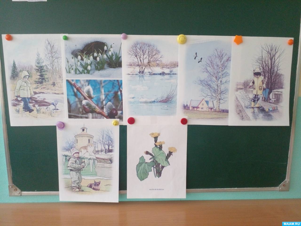 Воспитатель размещает на доске иллюстрации на тему «Весна».