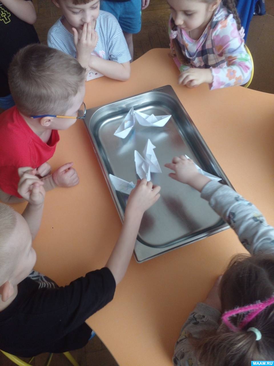 Воспитатель: Посмотрите, какая лужа появилась восле весеннего дождика. Предлагаю запустить кораблики.