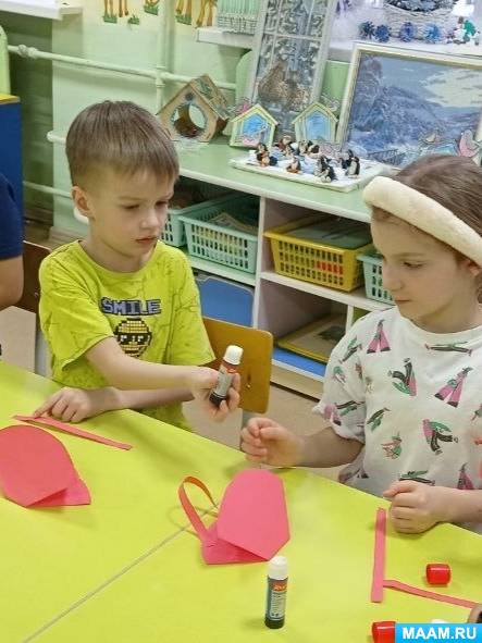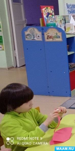 Воспитатель: помогаю индивидуально, слежу за техникой безопасности при работе с ножницами, напоминаю о правилах аккуратного наклеивания.