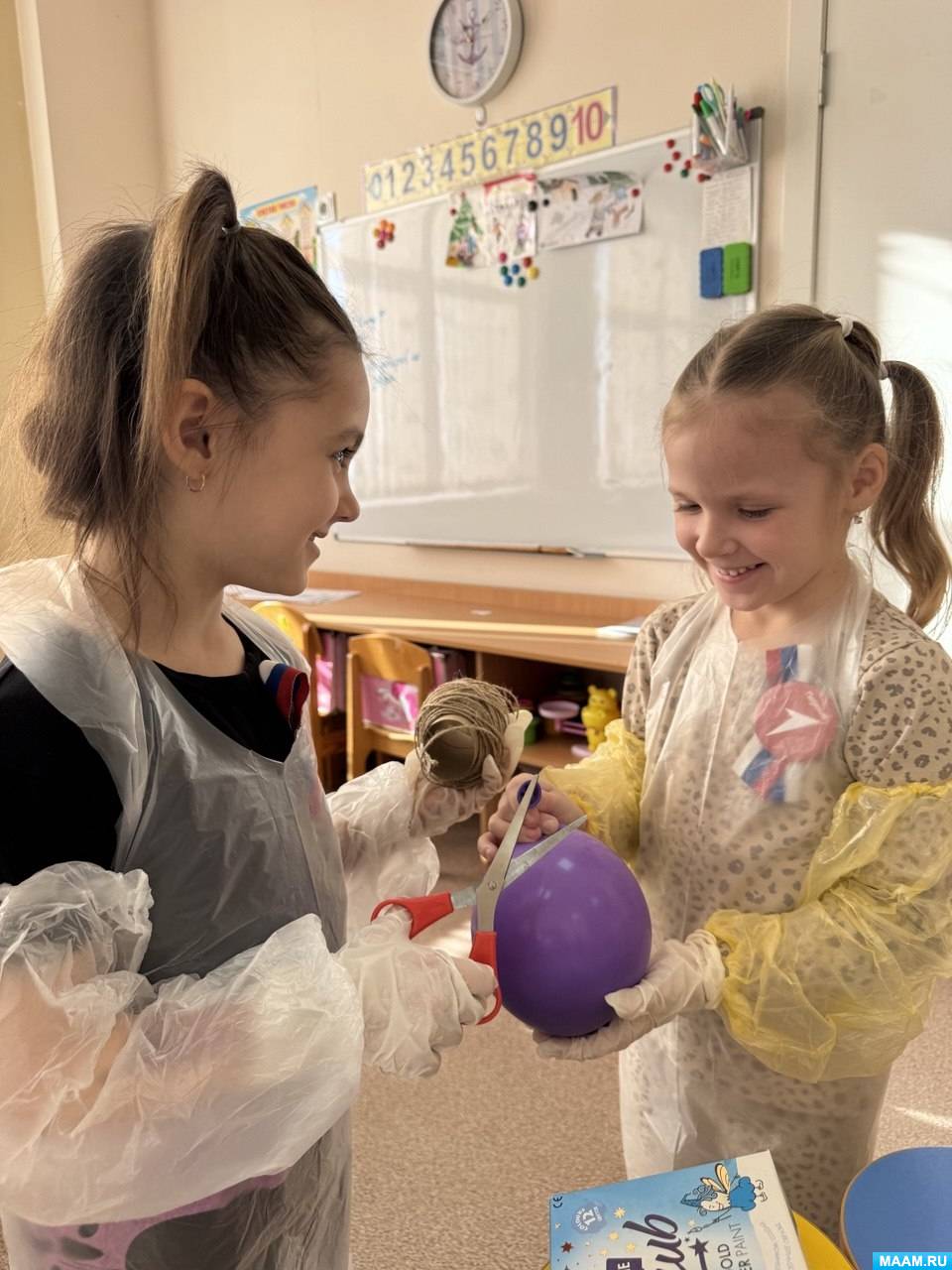 Формы для воды, гуашь, разноцветные нитки, игрушки, ножницы, воздушные шары, перчатки, нарукавники, фартуки.