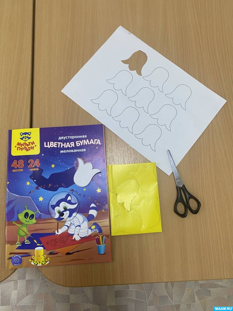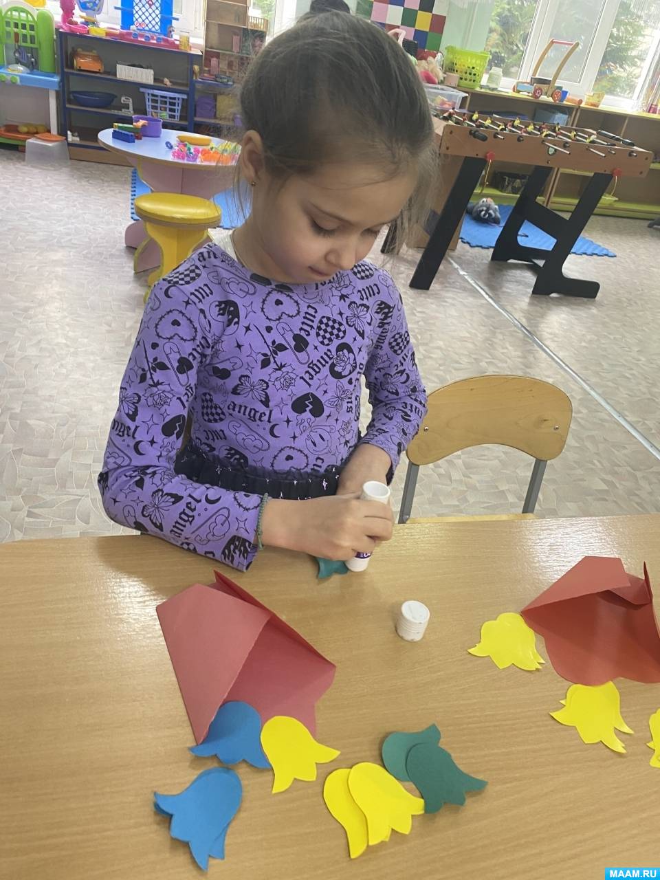 1 этап: Дети вырезают по шаблонам цветы из цветной бумаги, сворачивают цветной лист бумаги конвертиком или в виде кулечка, или веером и приклеивают по 3 шт. во внутрь конвертика цветы.