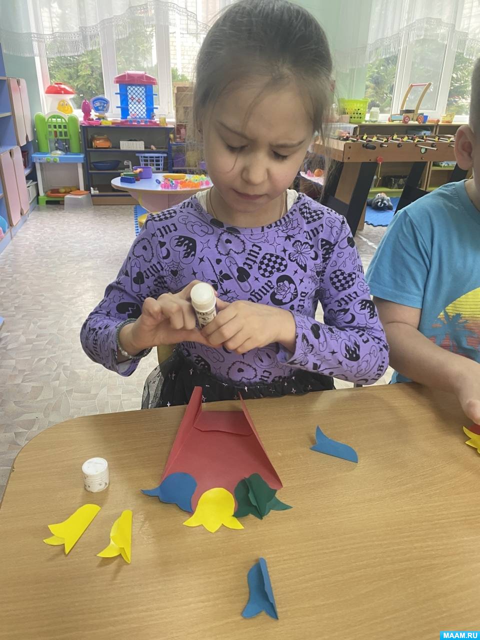 2 этап: Дети сгибают пополам 6 шт цветов и приклеивают их по 2 шт на каждый приклеенный цветочек, чтоб получились объемные цветы.