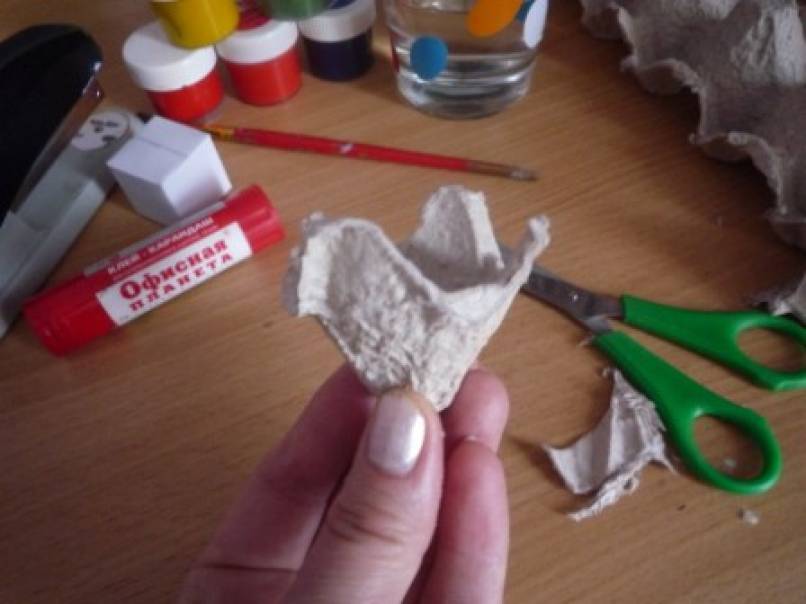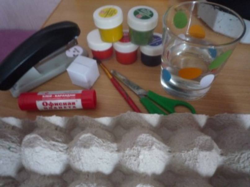 Для работы необходимо:кассета из-под яиц,клеящий карандаш,степлер,гуашь для раскрашивания ячеек-колокольчиков,ножницы.