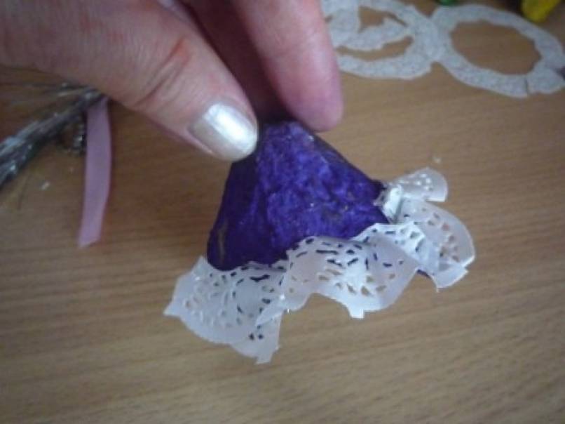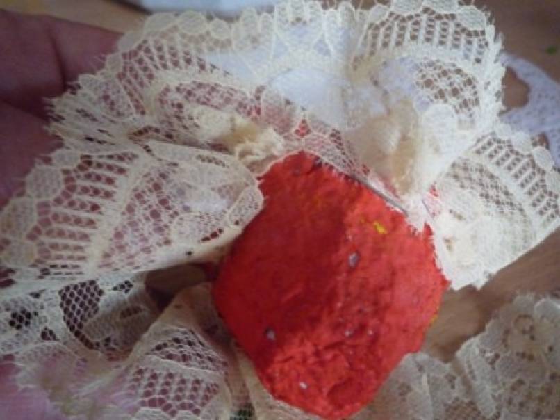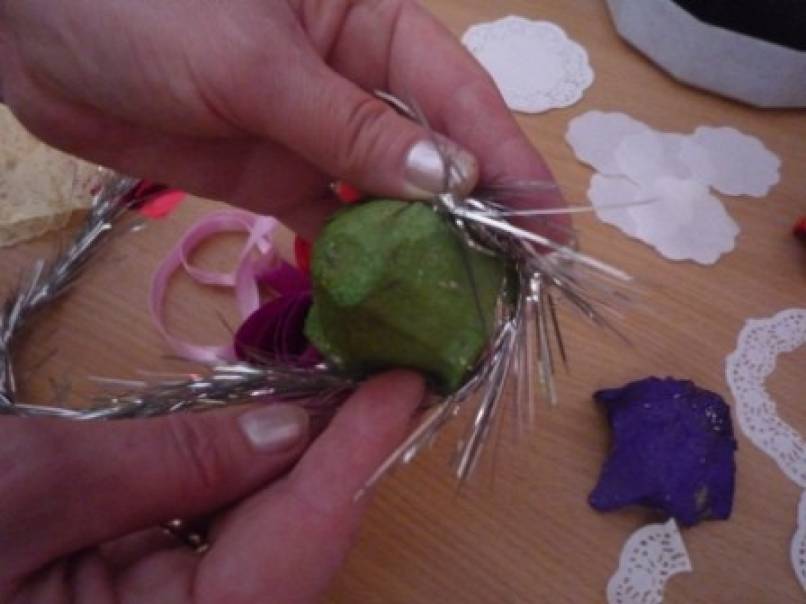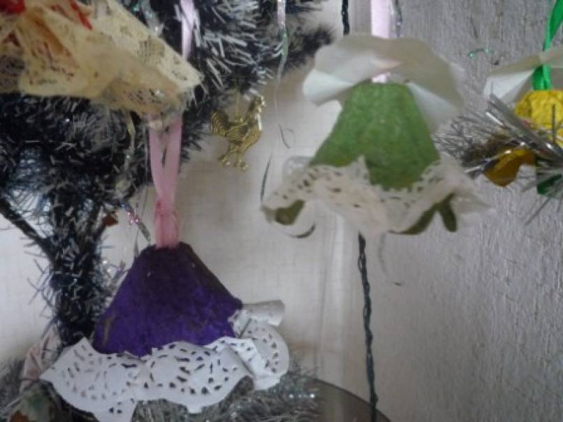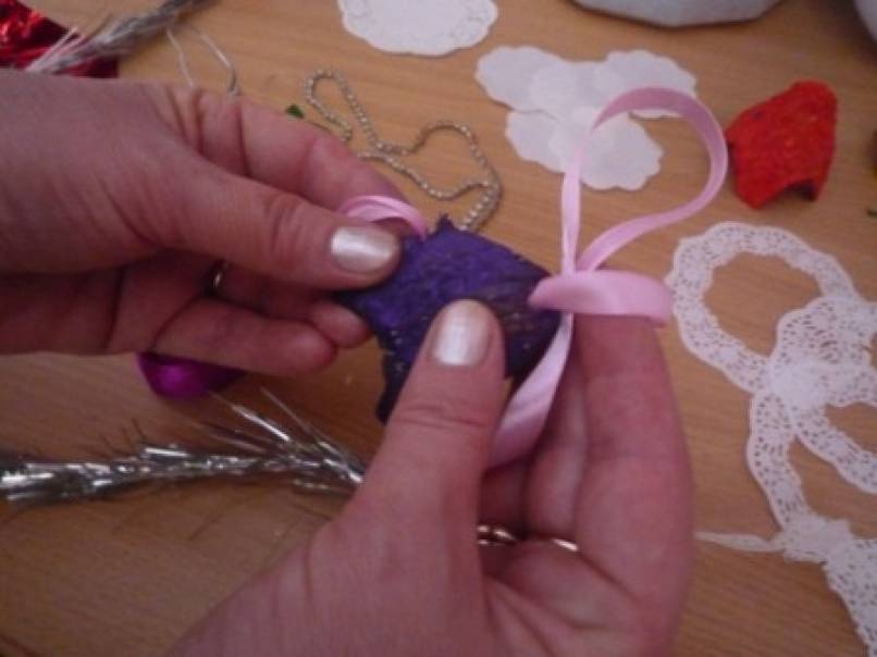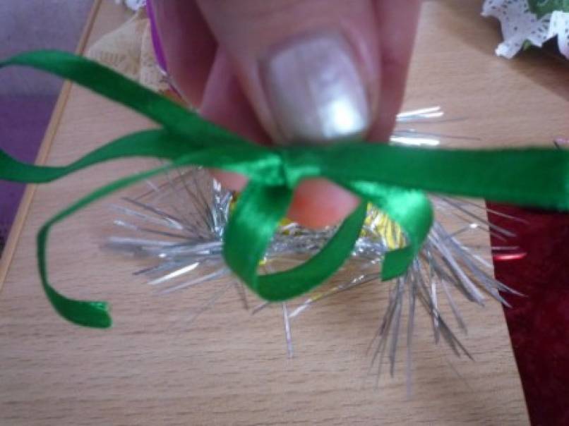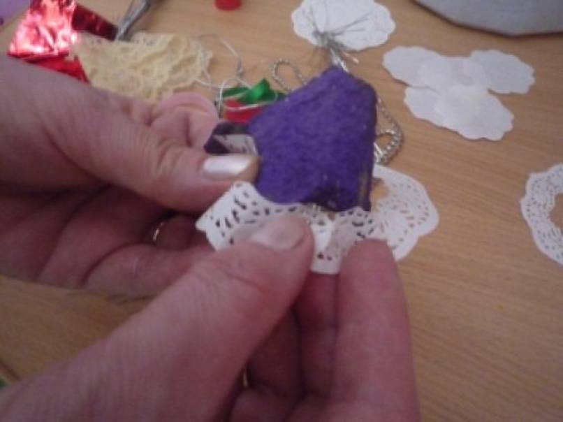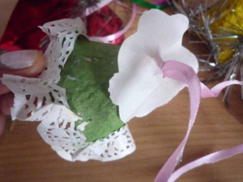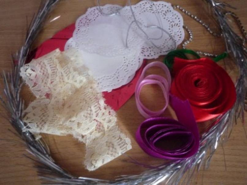 Для украшения:маленькие,круглые салфетки,гипюровая тесьма,атласная лента,ёлочная мишура.