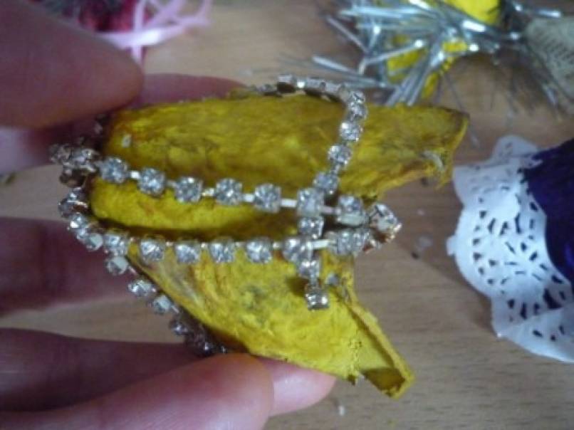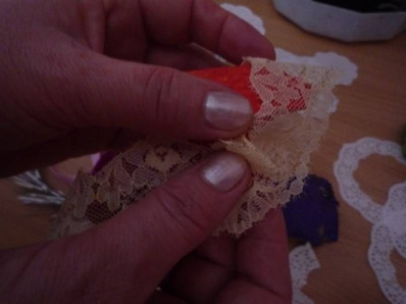 Низ первого украсила вырезанной ажурной салфеткой,второй ёлочной мишурой,последующие гипюром и бусинами от старого ободка.