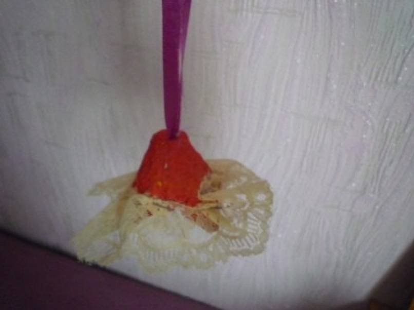 Делаем отверстие сверху колокольчика и вставляем разноцветные атласные ленточки для подвески,завязываем узелком внутри колокольчика,чтобы лента не вылетела. Перед тем,как вставить ленту,к двум колокольчикам я добавила серединки маленьких салфеток,которые остались после вырезывания.