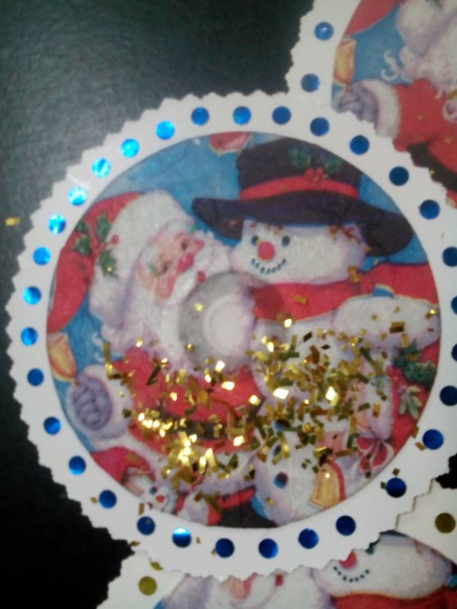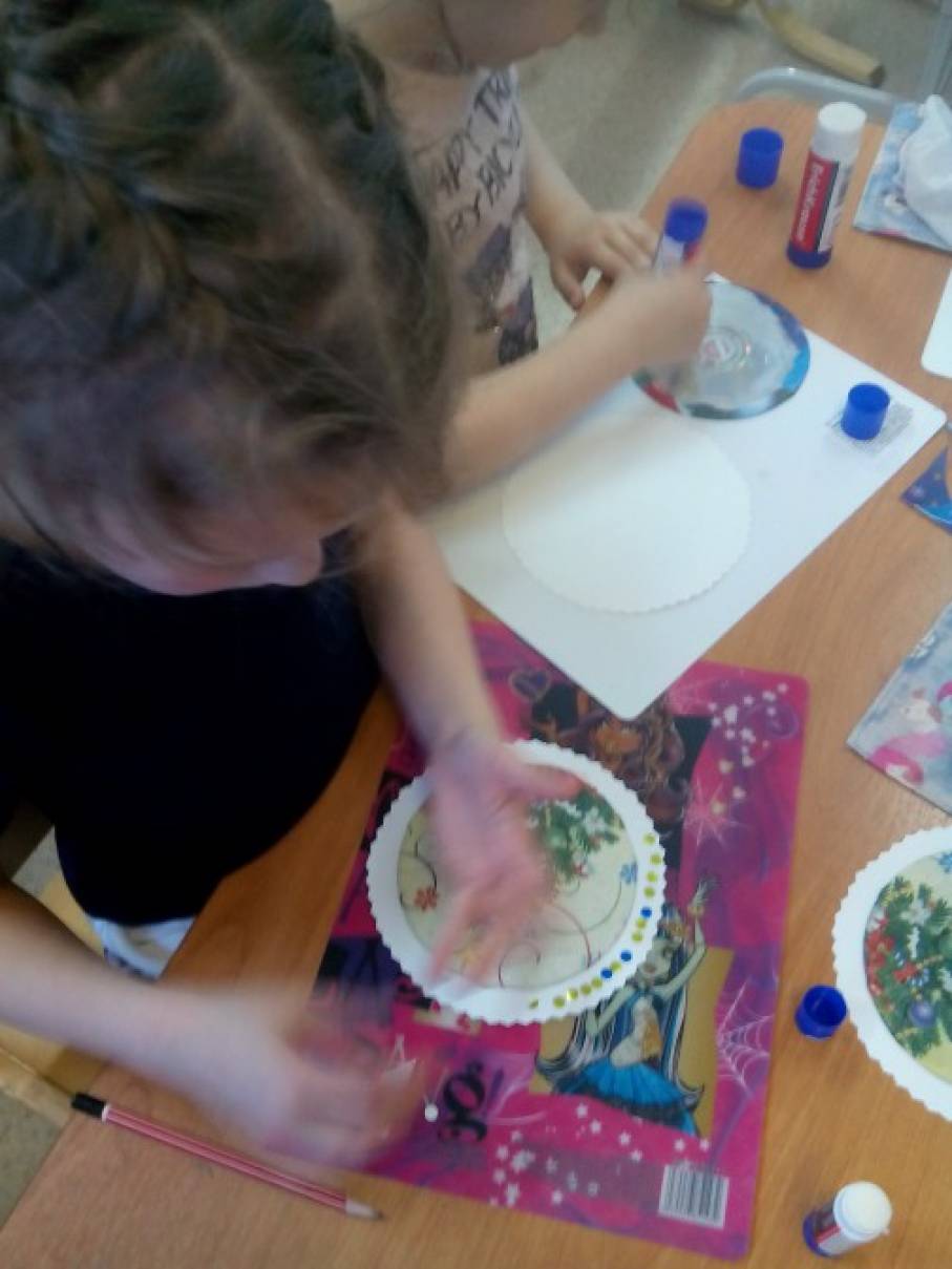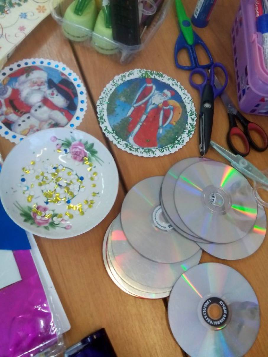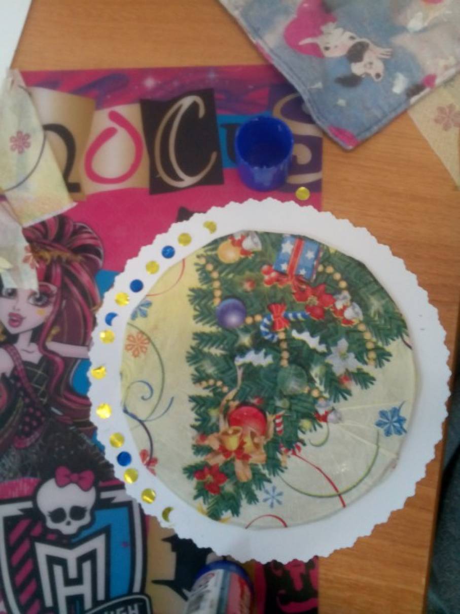 На диски мы приклеили декоративную салфетку так, чтобы было видно рисунок (салфетки многослойные – один белый слой убрать. Если убрать два слоя диск будет просвечиваться)