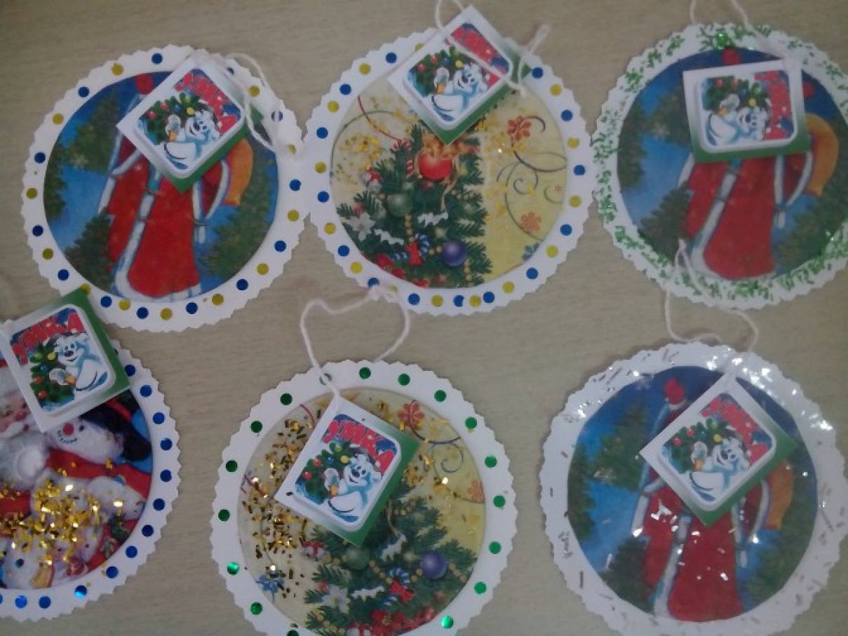 В конце я шуруповертом делала отверстия на поделках и продевала в них нить с эмблемой нашего детского сада.