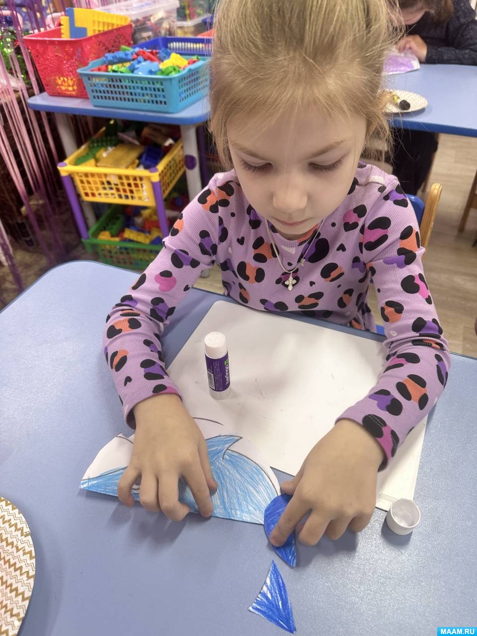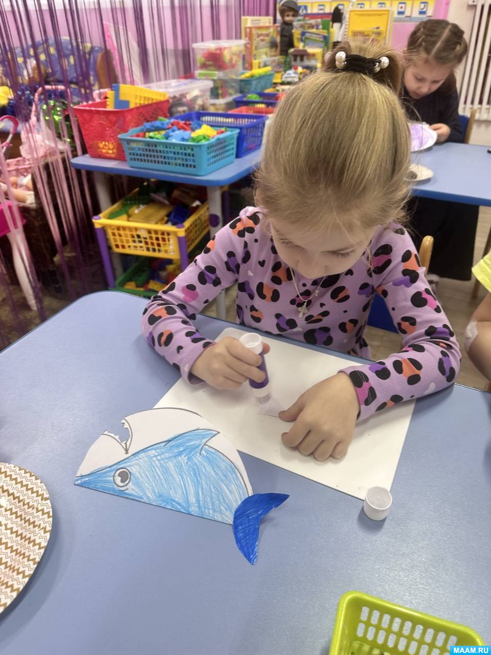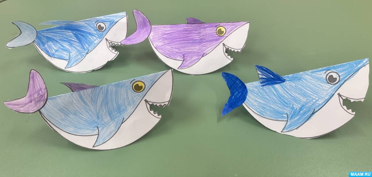 1. Дошкольники раскрасили шаблон акулы цветными карандашами (синим, голубым, фиолетовым). Брюхо акулы оставили белым. Воспитатель следит за посадкой детей, напоминает, о том, как правильно держать карандаш.