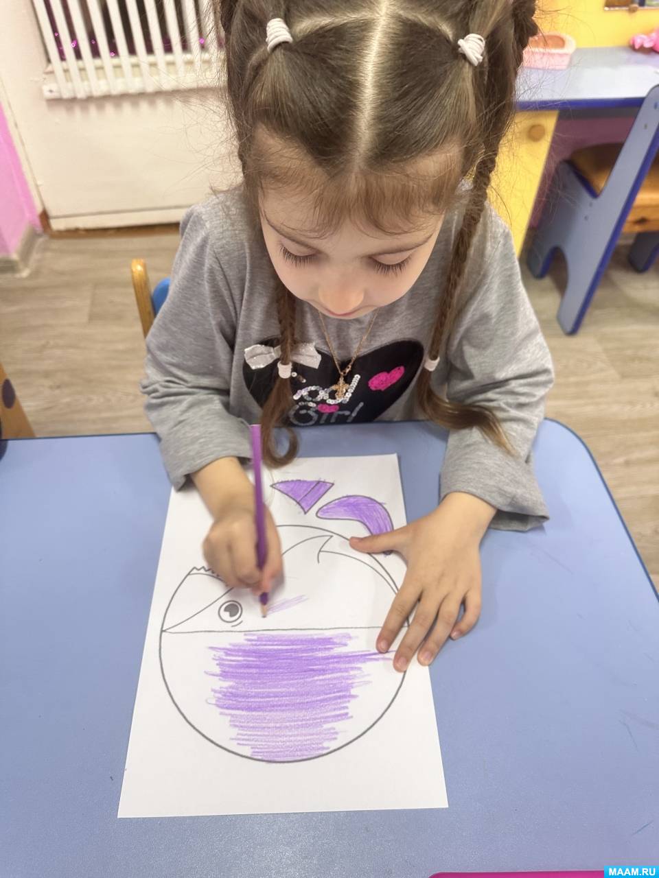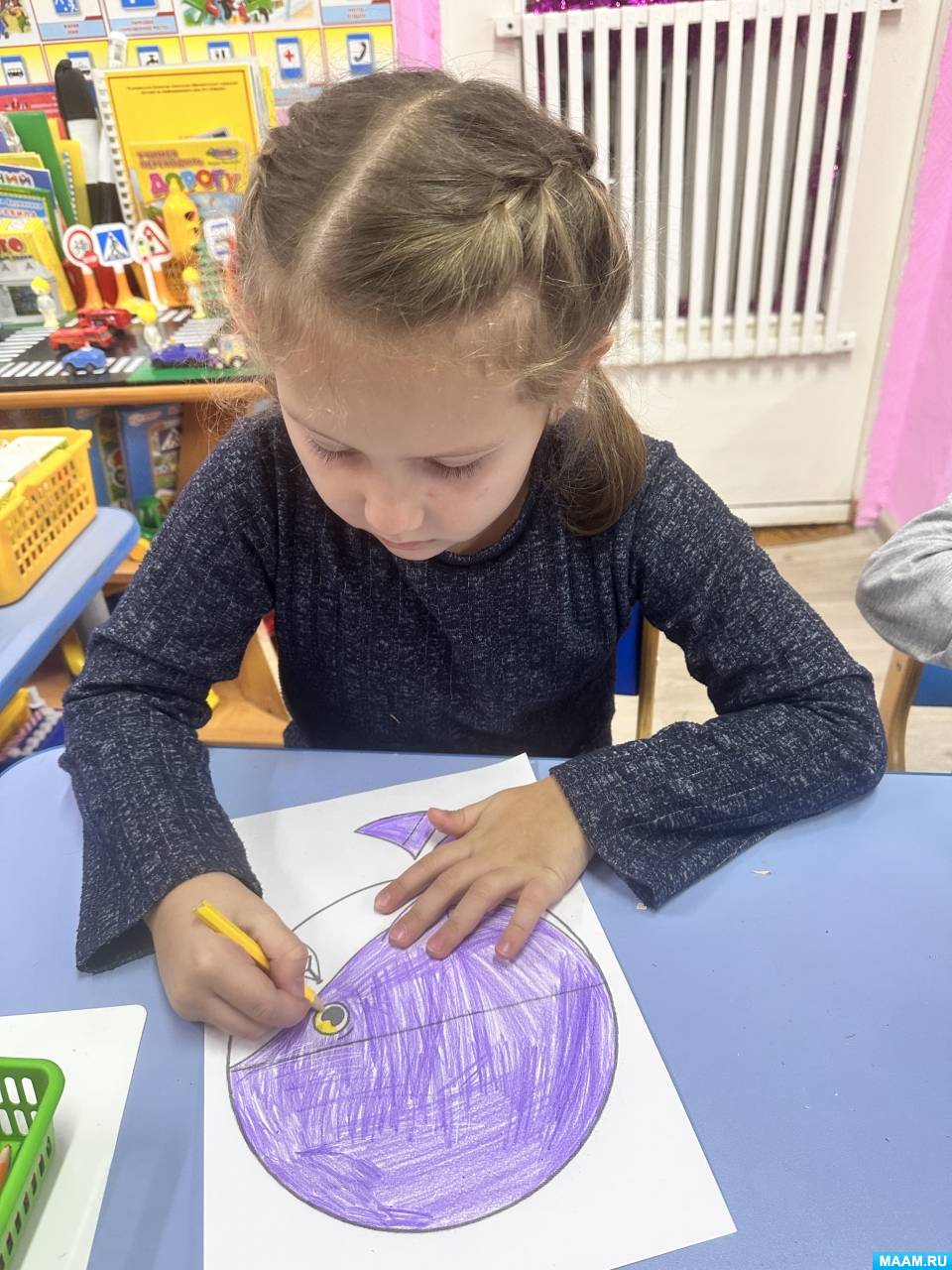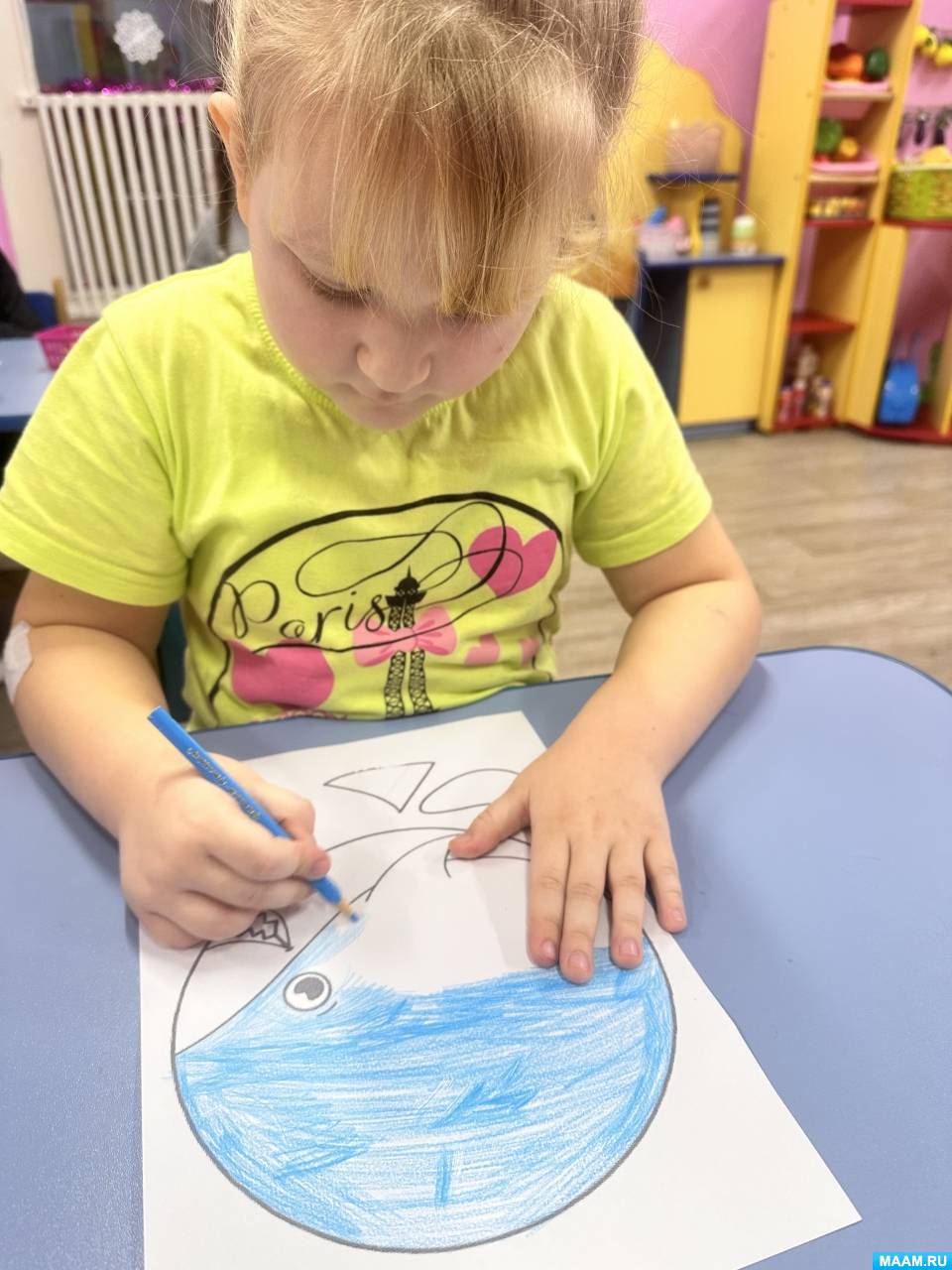 1. Дошкольники раскрасили шаблон акулы цветными карандашами (синим, голубым, фиолетовым). Брюхо акулы оставили белым. Воспитатель следит за посадкой детей, напоминает, о том, как правильно держать карандаш.