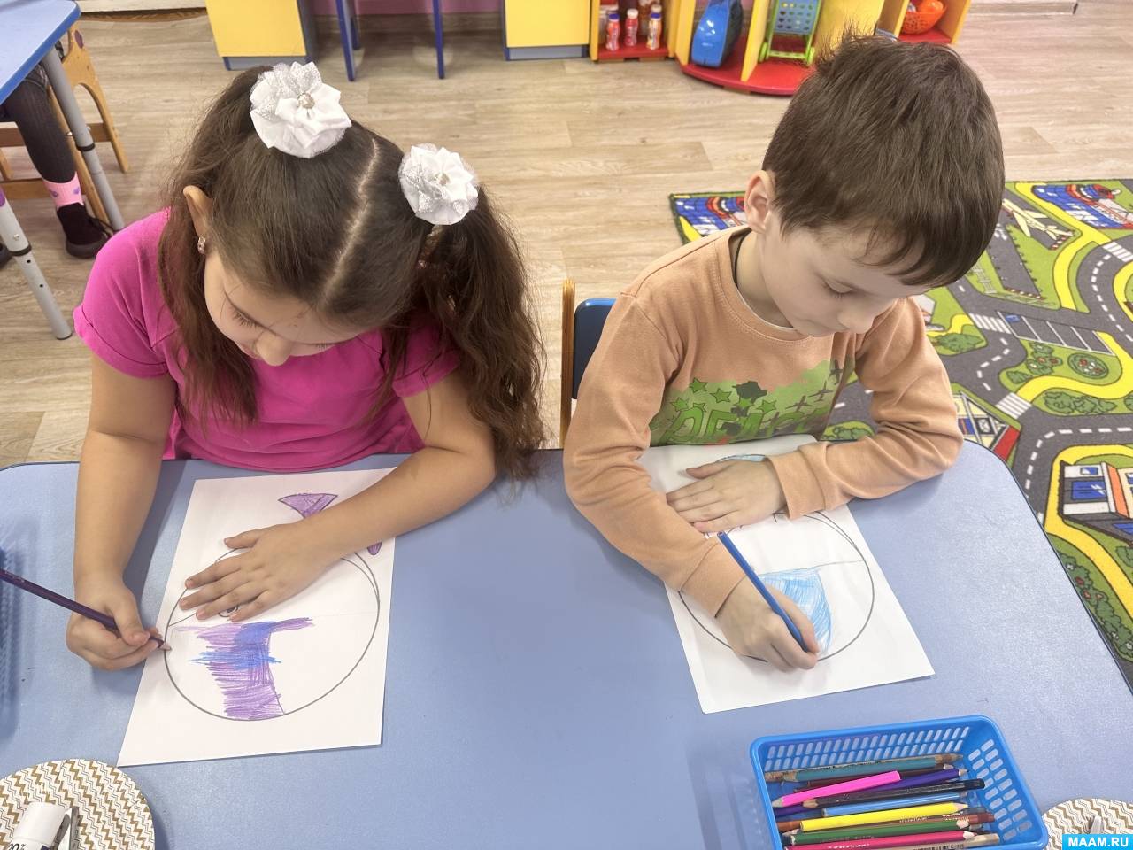 3. Ребята сложили шаблон-круг по пунктирным линиям пополам.