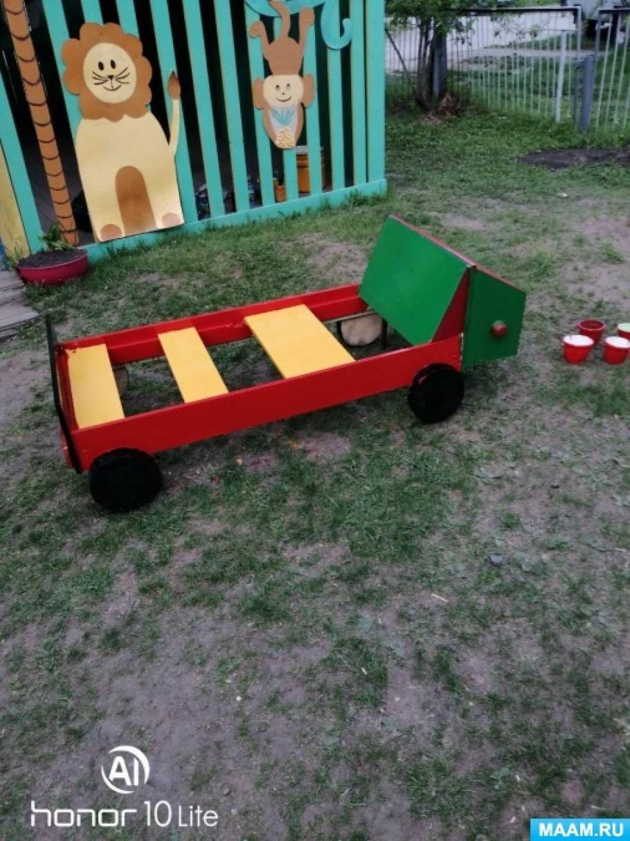 Ребята гордятся своими мамами и папами за то, что они помогли украсить то место, где в летний период они проводят немало времени. Для изготовления поделок использовали: деревянные обрезки, пластиковые бутылки,кубики, пробки.