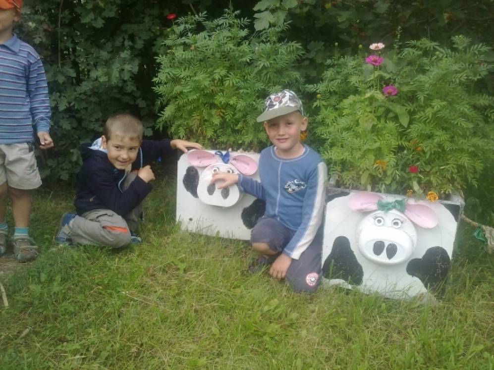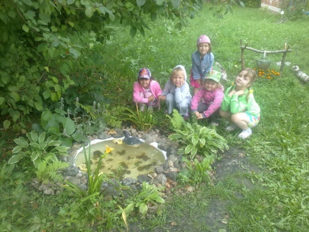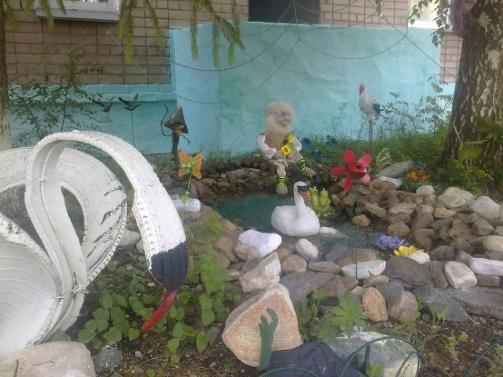 Прудик мы сделали с ребятами своими руками из колеса,дно выстлали банером,вокруг посадили цветы, а в пруду у нас живут уточка с утятами