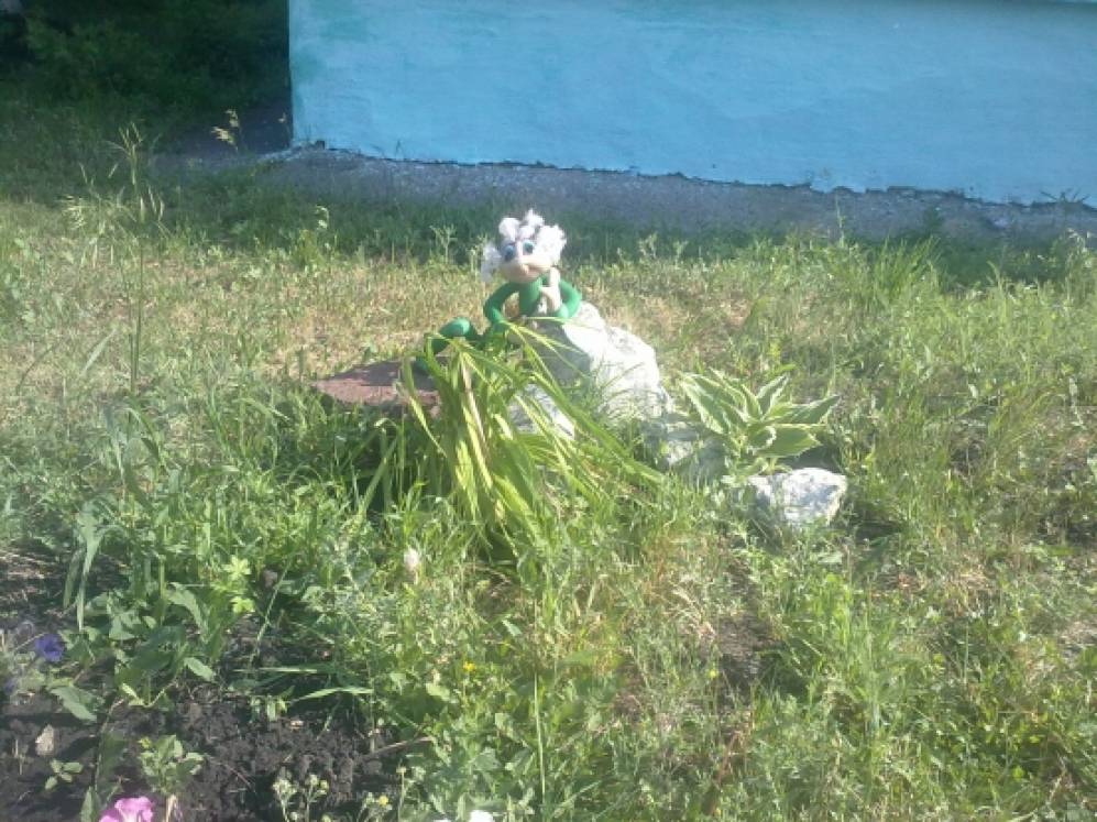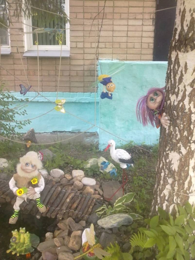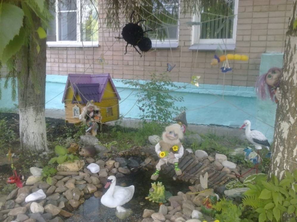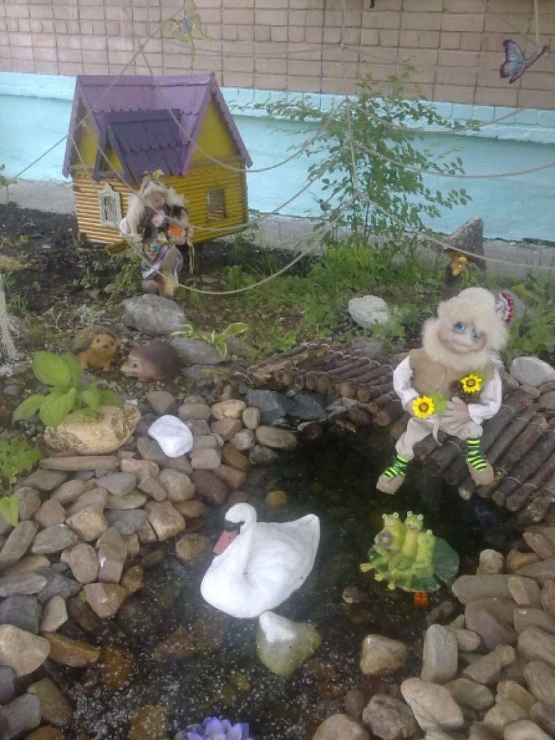 Лесной уголок со сказочными героями разместились у водоёма, который мы тоже сделали своими руками