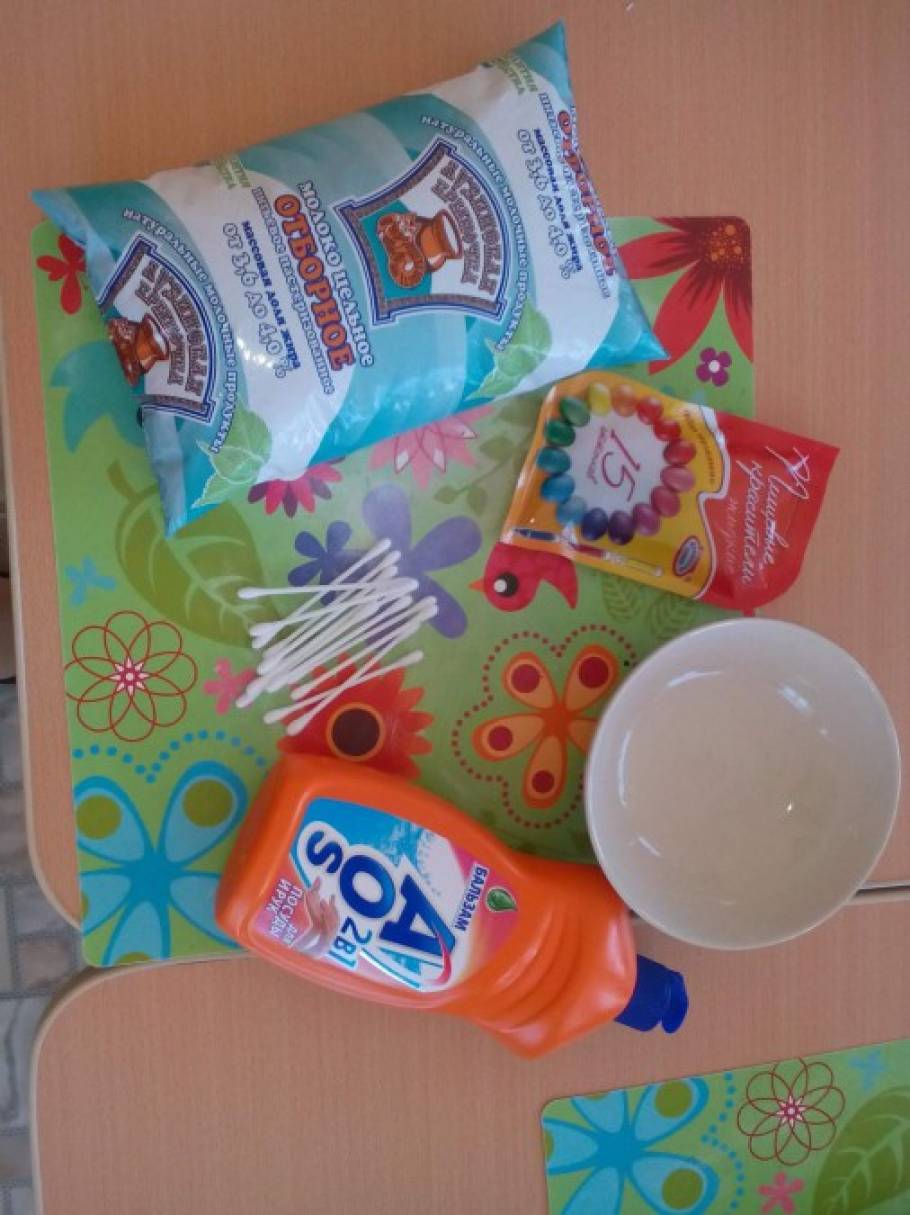 Для эксперимента нам понадобится: молоко с большим процентом жирности, краски пищевые (мы взяли жидкие пасхальные краски, глубокая тарелка, ватные палочки (на каждого ребенка) и средство для мытья посуды.