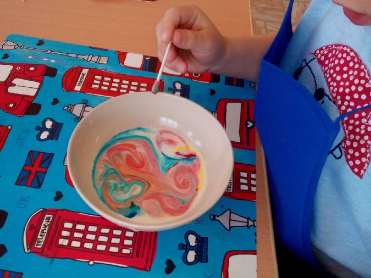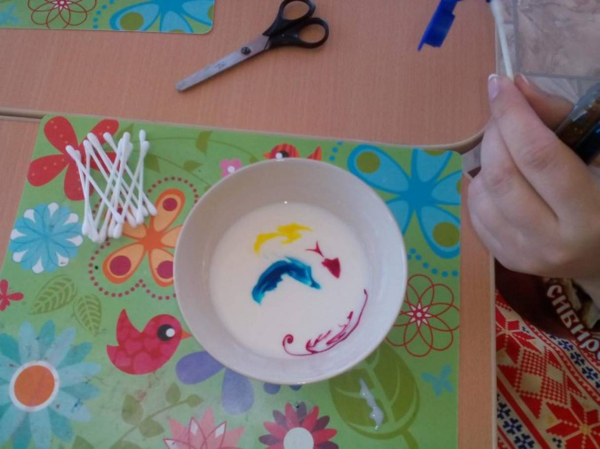 после этого берем ватную палочку, наносим на нее средство для мытья посуды и просто опускаем край палочки в тарелку с молоком и краской. Необходимо объяснить детям, что палочку нужно просто опустить, а не перемешивать её молоко, иначе эксперимент не получится.