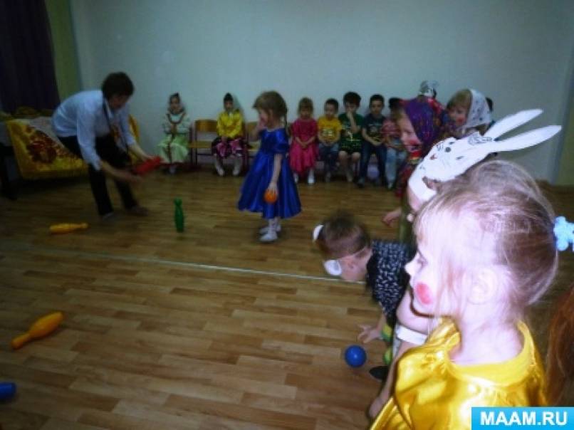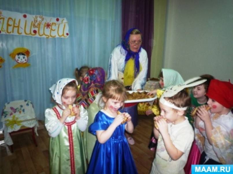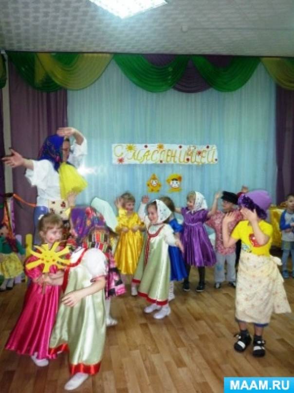 Под народные мелодии дети,одетые в костюмы для празднования Масленицы, веселились:пели народные песни"Как на масленой неделе",водили хороводы,читали заклички про весну и Масленицу. В гости приходили волк,медведь и заяц,которые тоже были не против поиграть с ребятами.