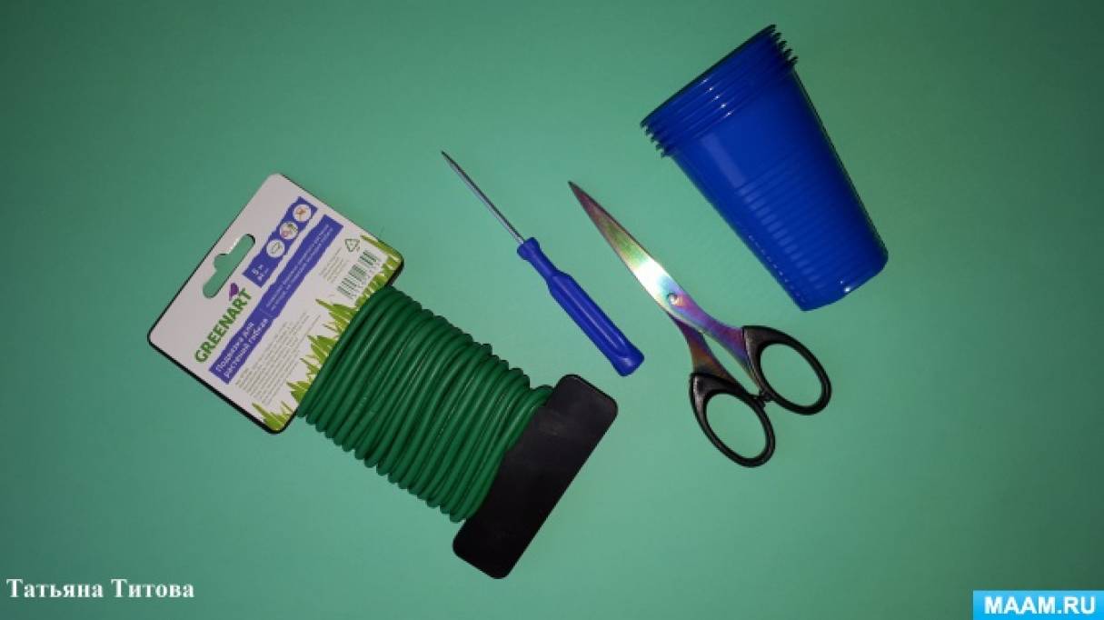 Материал: пластиковые стаканчики, шило, ножницы, толстая проволока.