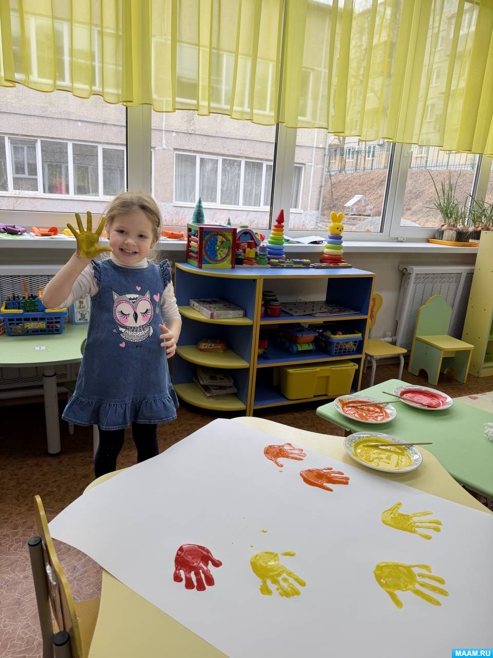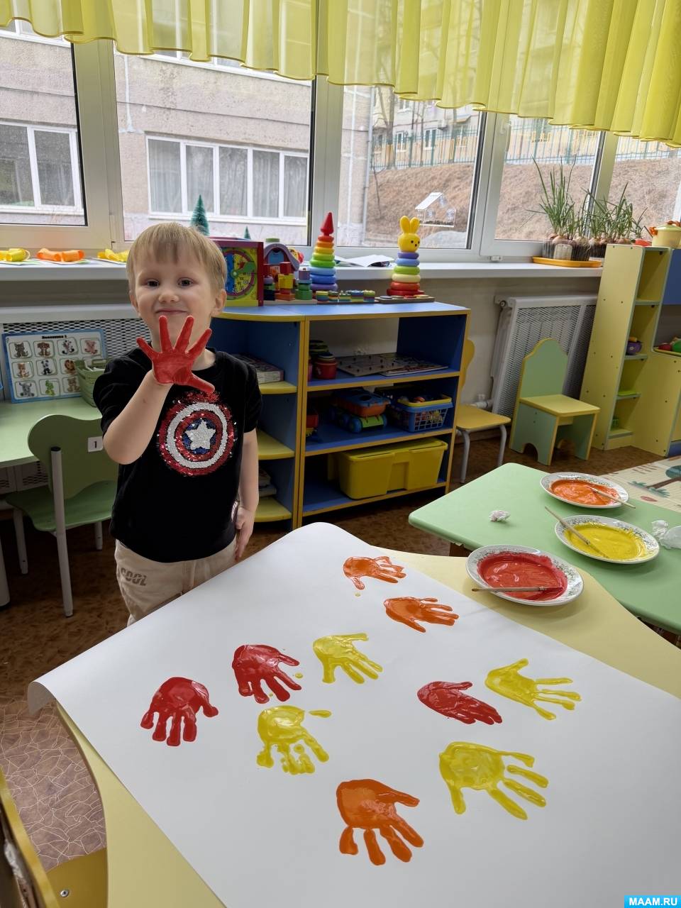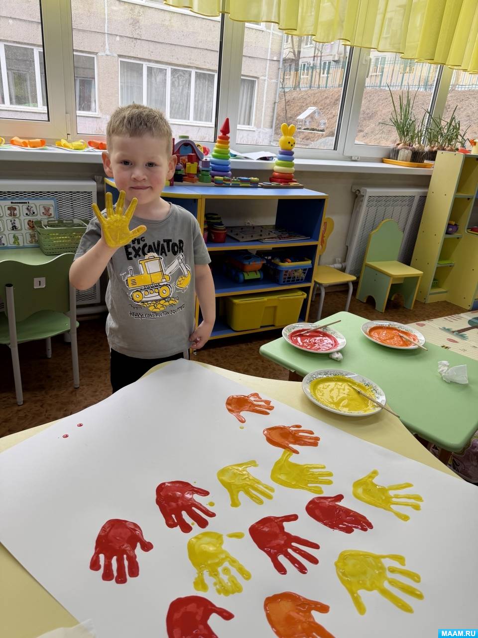 Воспитатель: Правильно цветы, но они у нас будут необычные, а из наших ладошек.