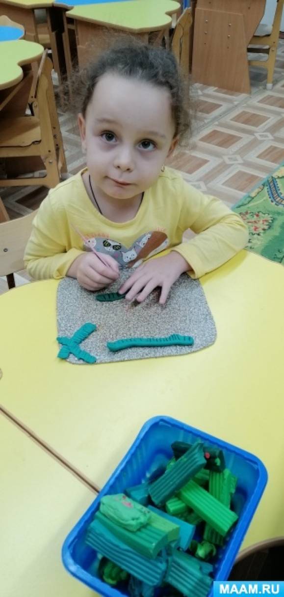 Дети вспоминают приемы лепки. Шарик- раскатываем на ладонях круговым движением или на доске для лепки и сплющиваем его пальцами (блинчик, столбики - прямым движением рук или на доске, сплющиваем и надрезаем стекой кончик колбаски.